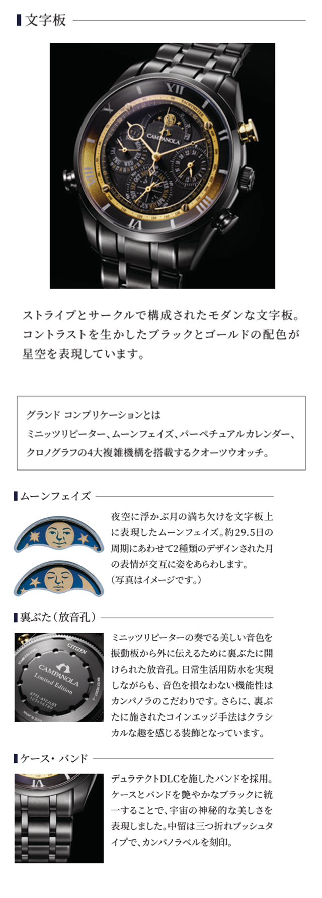 | 仕様 | 日常生活用防水 ミニッツリピーター機能 ムーンフェイズ機能 パーペチュアルカレンダー クロノグラフ デイ&デイト表示 日付早修正機能 4時間表示機能 文字板:電気鋳造 数量限定250本 日本製 |