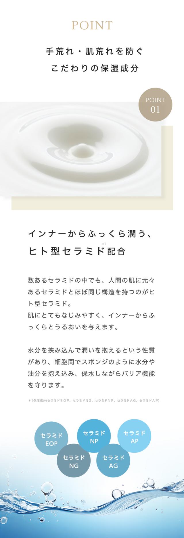 ■全成分:水、ホホバ種子油、グリセリン、プロパンジオール、ステアリン酸グリセリル(SE)、ベヘニルアルコール、ポリソルベート60、スイゼンジノリ多糖体、セラミドEOP、セラミドNG、セラミドNP、セラミドAG、セラミドAP、水添レシチン、ダイズステロール、ミリスチン酸ポリグリセリル−10、コレステロール、BG、ミツロウ、イソステアリン酸バチル、EDTA−2Na、クエン酸Na、クエン酸、フェノキシエタノール