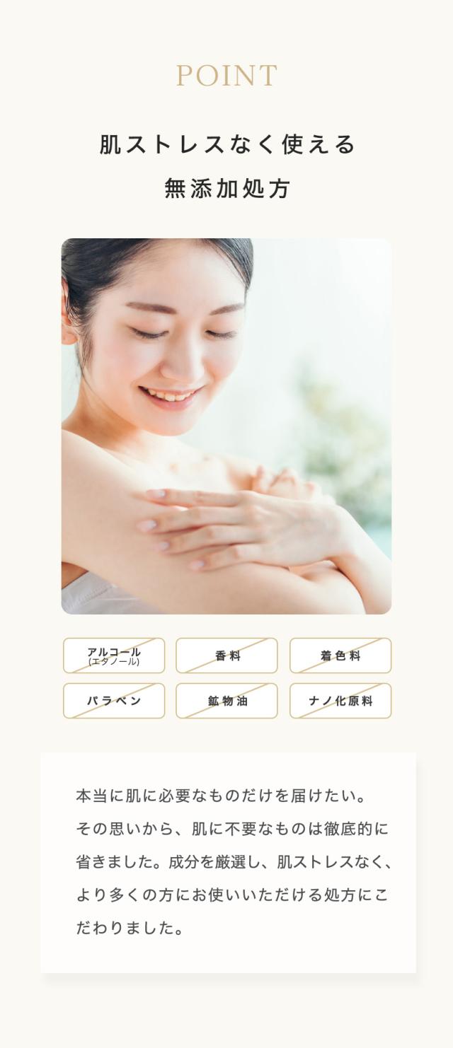 敏感肌の方でも使いやすいよう余計な成分を配合せず、極力シンプル処方・無香料 にこだわりました。カサカサと乱れたバリア機能をサポートし、キメを整え潤いを与え、ゆらぎはじめたお肌を保護します。