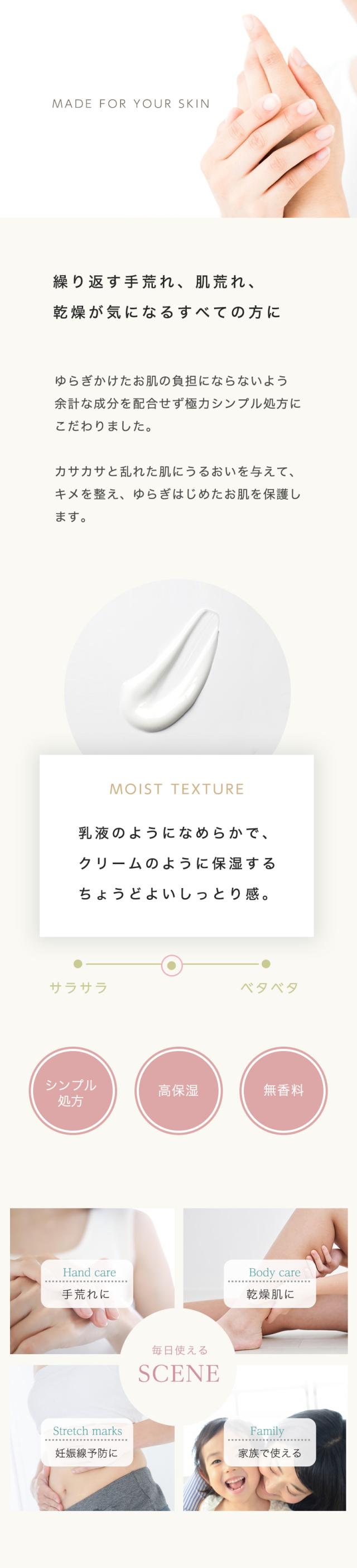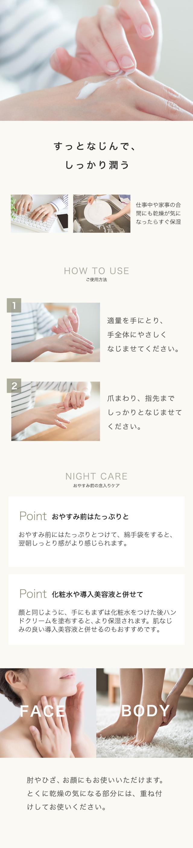 乳液のようになめらかで、クリームのように保湿する、べたつかないけどちょうどよいしっとり感を目指しました。 ハンドクリーム、ボディークリームとしてはもちろん 、お顔の 保湿クリーム としても全身にお使いいただけます。
