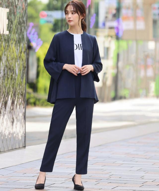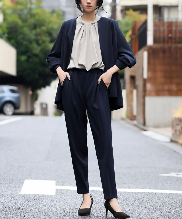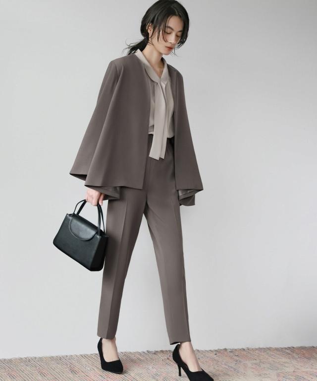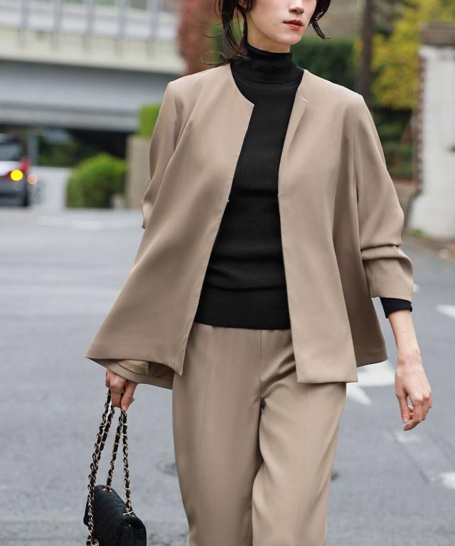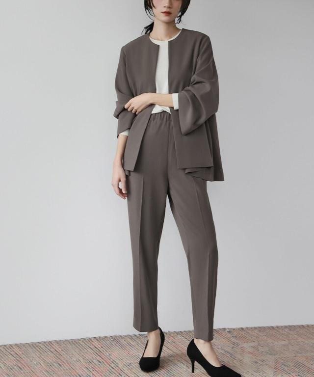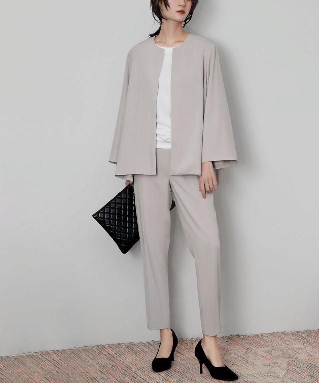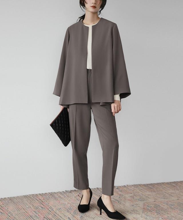 Aラインジャケットとテーパードパンツの2点セット。