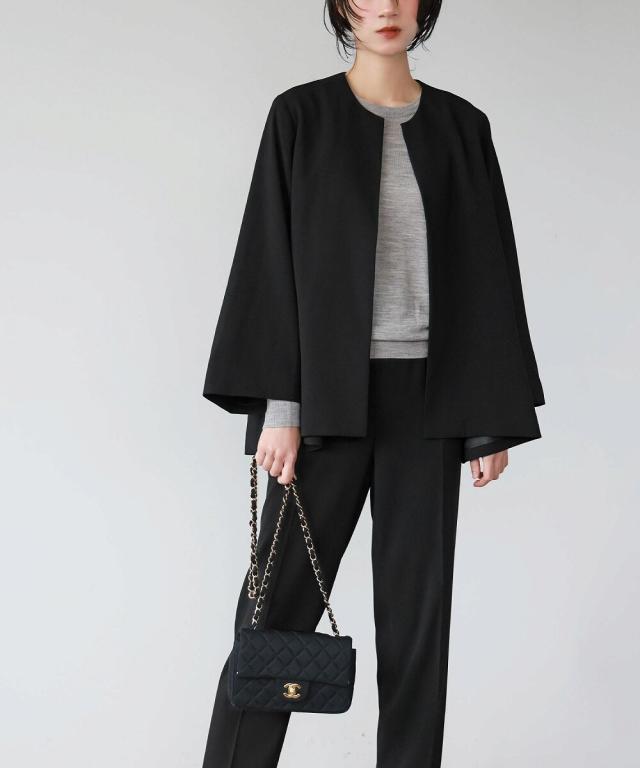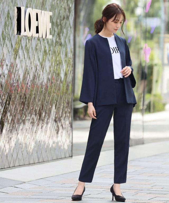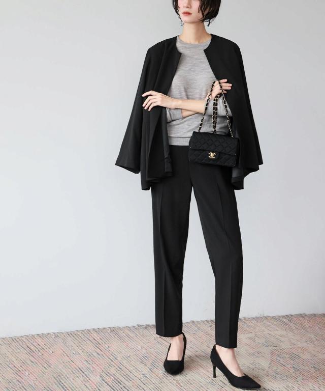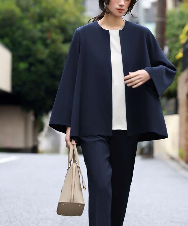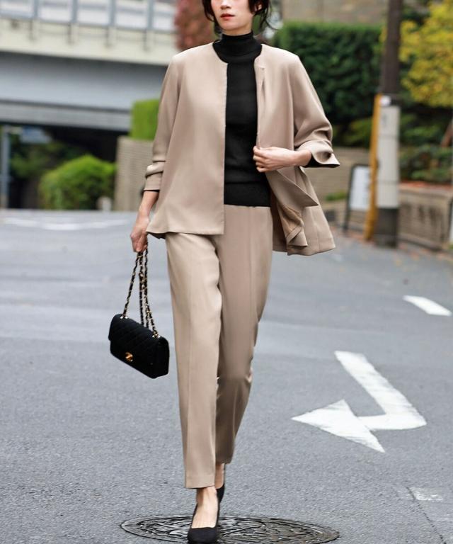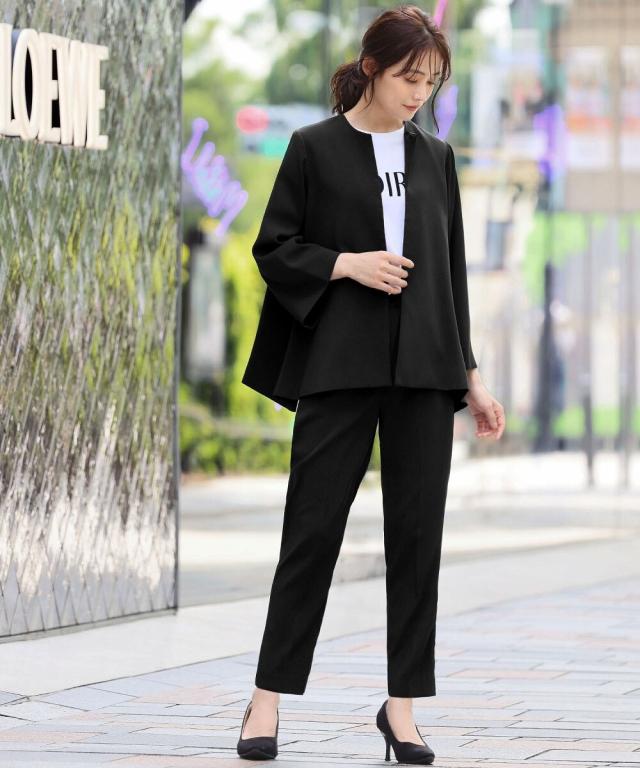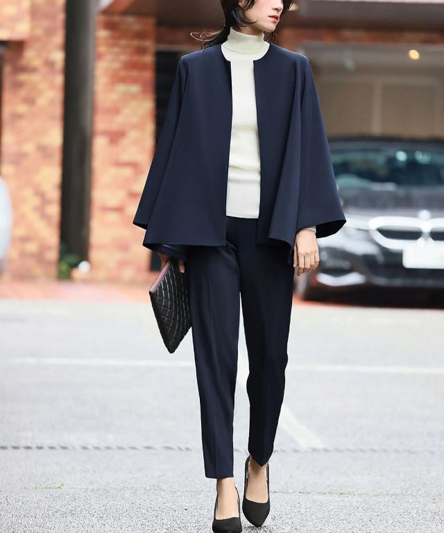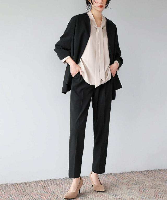 Aラインジャケットとテーパードパンツの2点セット。