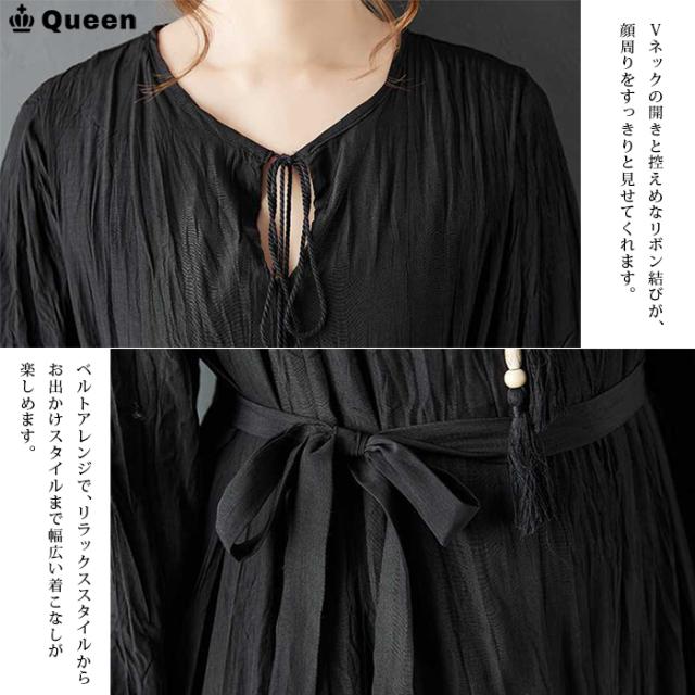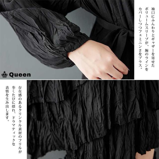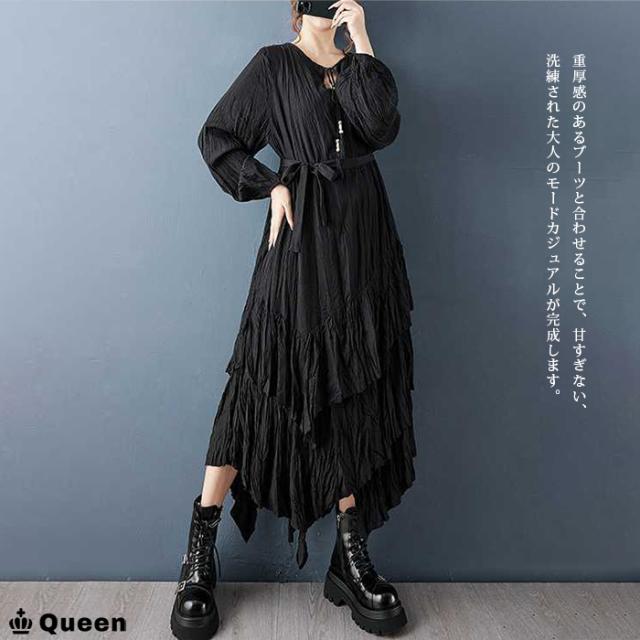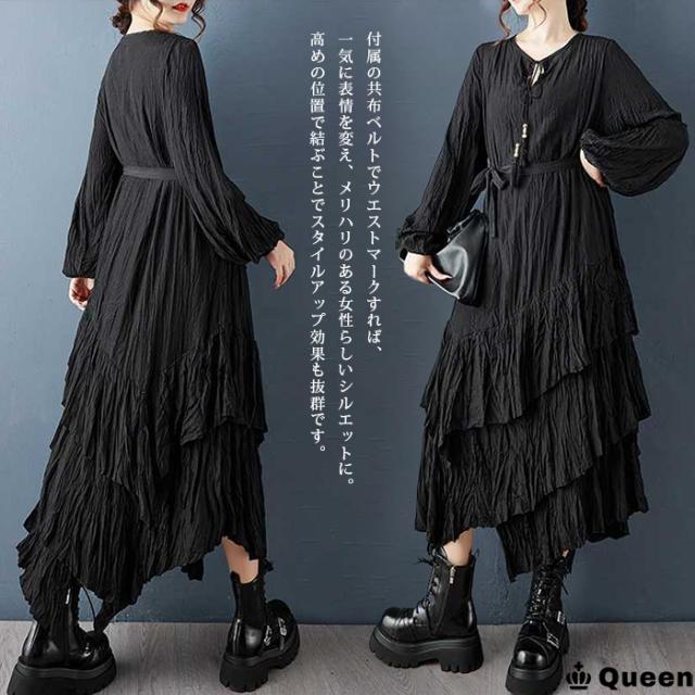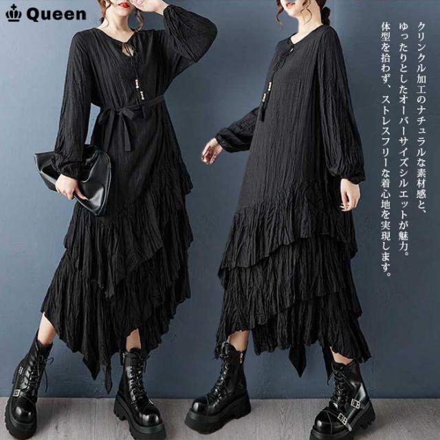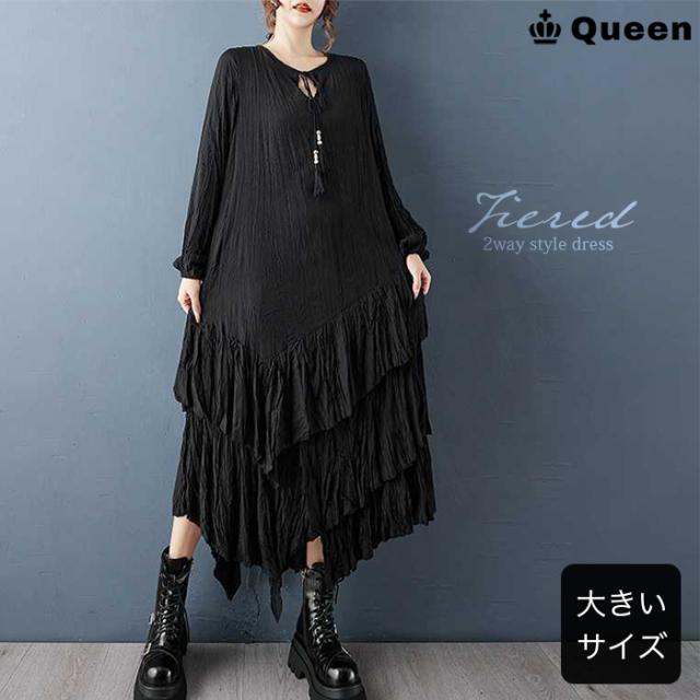 ★☆大きいサイズ ワンピース レディース ティアード 長袖 ロング 黒 クリンクル エスニック 2way 変形デザイン しわ加工 春 秋 冬 LL 3L 4L 5L 6L Queen☆★