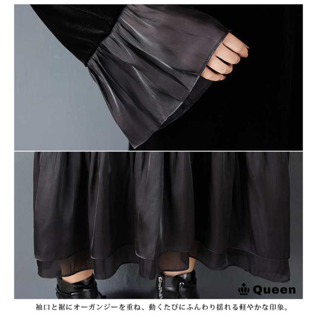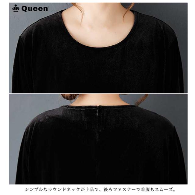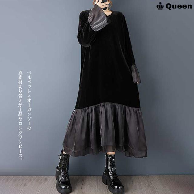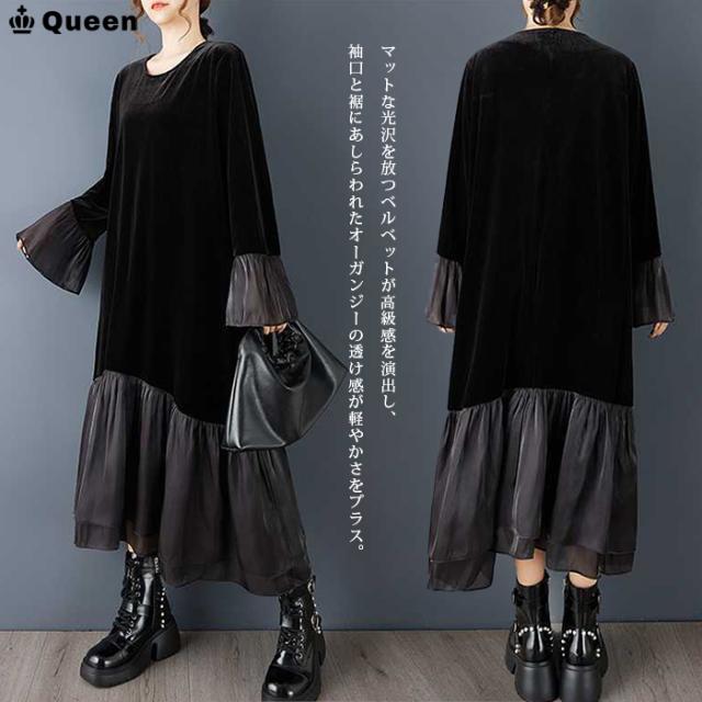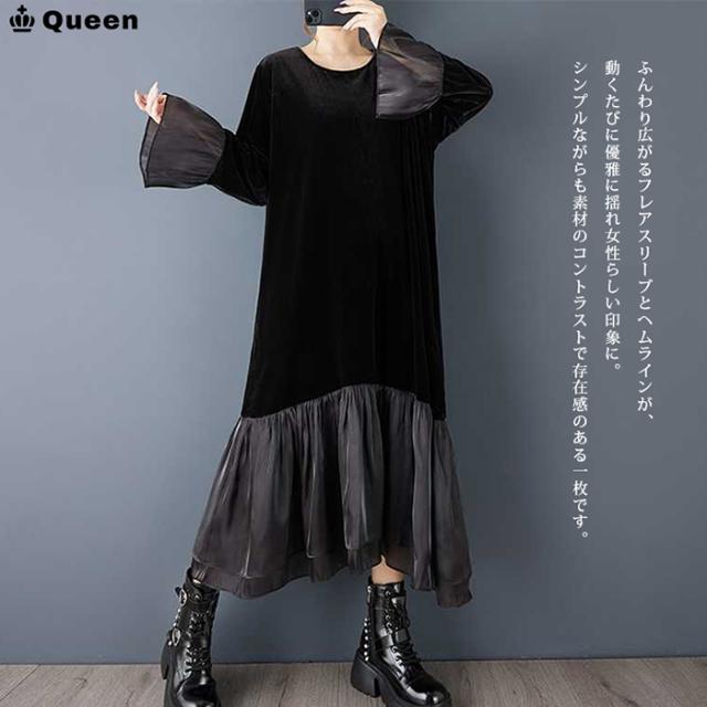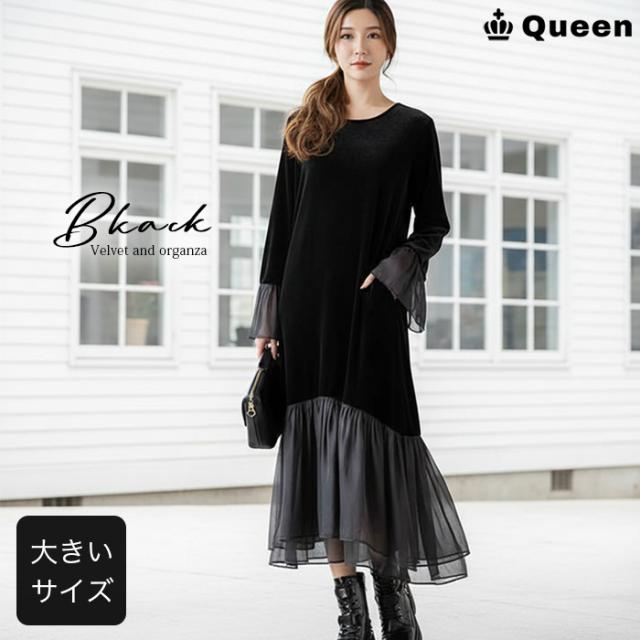 ★☆大きいサイズ ワンピース レディース ロング 黒 ベルベット ベロア 異素材 マキシ丈 秋冬 ゆったり 体型カバー 上品 お呼ばれ LL 3L 4L 5L 6L Queen☆★