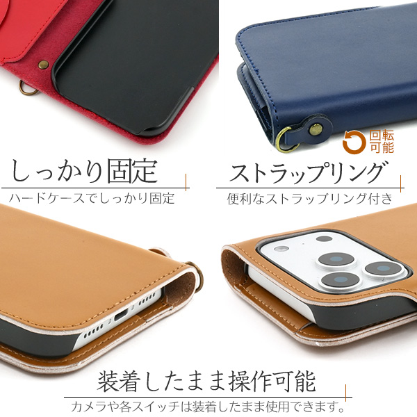 | 上質な牛革を全面に使用した、牛革手帳型ケース。 美しい質感と滑らかな触り心地の牛革を使用しています。 一つ一つ丁寧に制作しています。 実用新案登録済のカード落下防止フラップ付き! 逆さにしてもカード落下の心配がありません。 大切なカード収納時やネックストラップ使用時などに最適です。 内部ケースはハードケースなのでしっかりとスマートフォンを固定できます。 横開きタイプなので、手帳のように使うことができます。 また、内側にはカードポケット2つとフロント/サイドポケットが付いています。 しっかりと固定できるマグネット式スナップボタンを採用しています。 便利なストラップリング付きで、ストラップなどを装着可能です。 | ||||||||||||||
