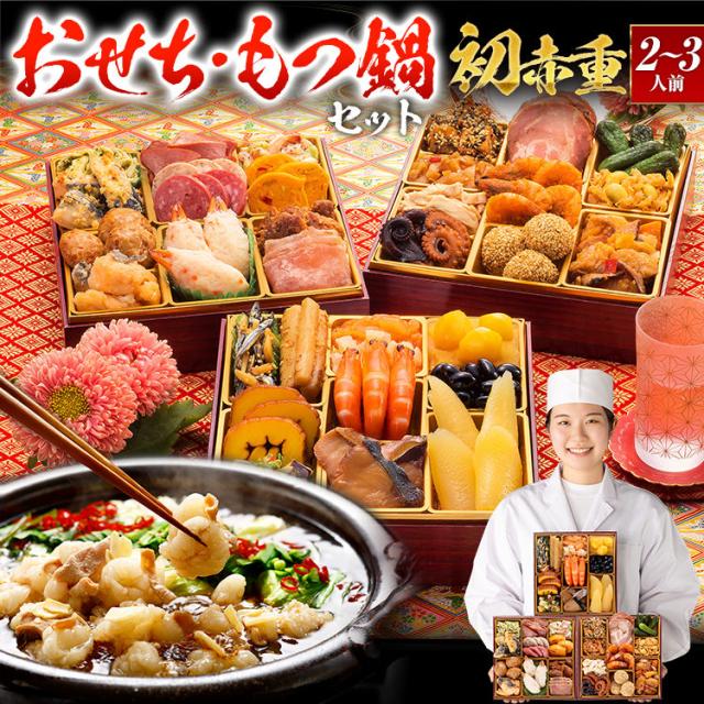 【おせち&もつ鍋セット】本格定番和洋中おせち『初赤重』≪6.5寸×3段重・全34品・2〜3人前 + もつ鍋5人前セット≫【送料無料】 おせち 2026 博多久松 おせち料理 2人前 3人前 醤油味 小腸 国産もつ 鍋