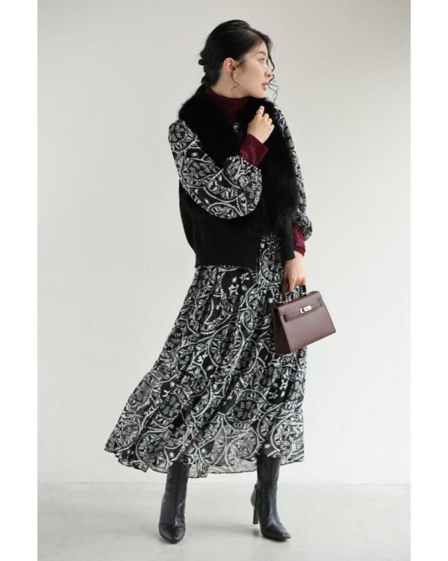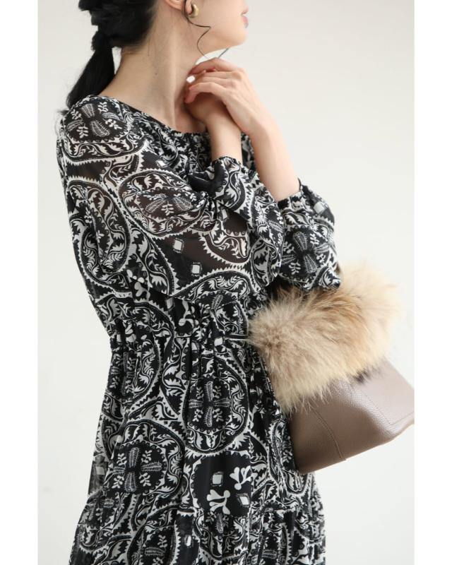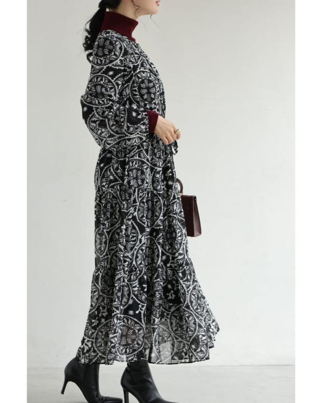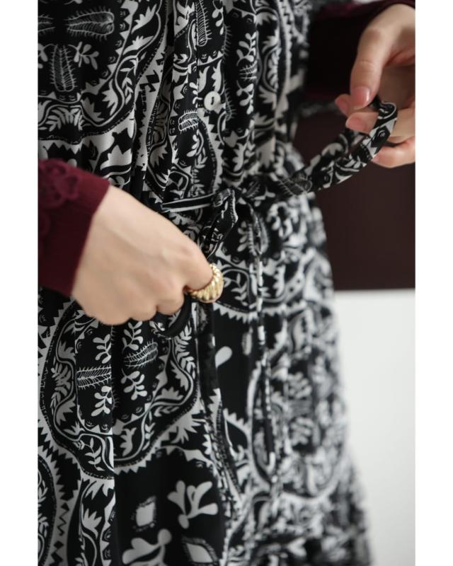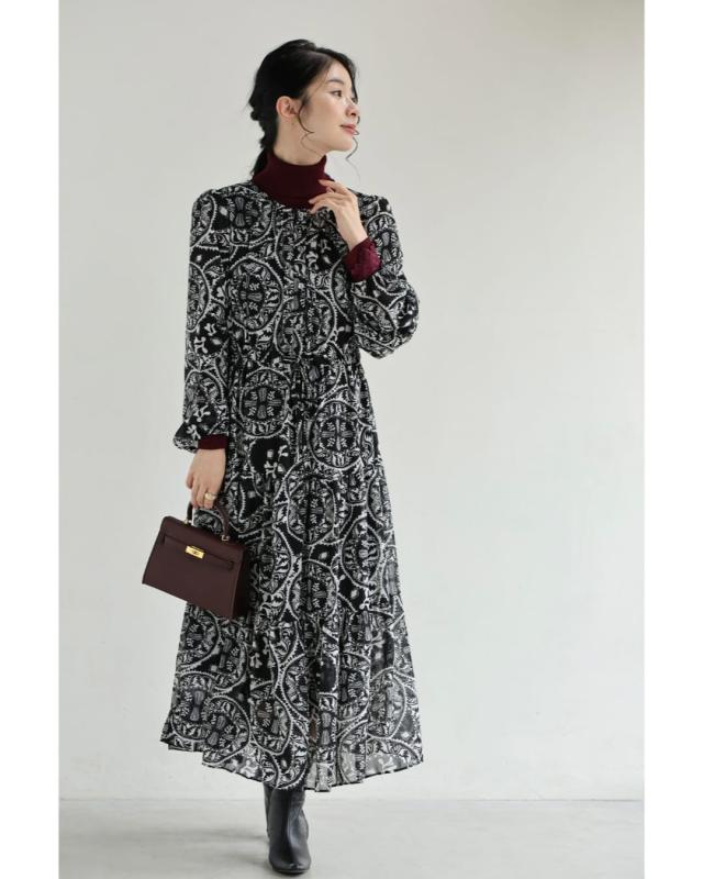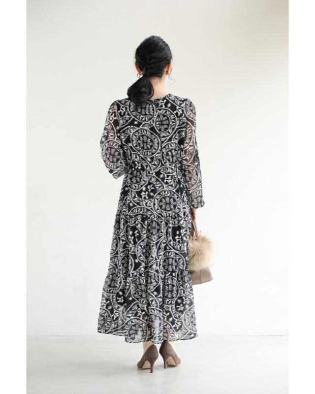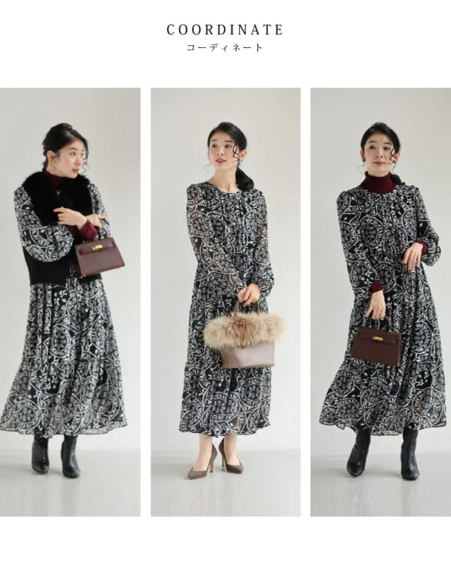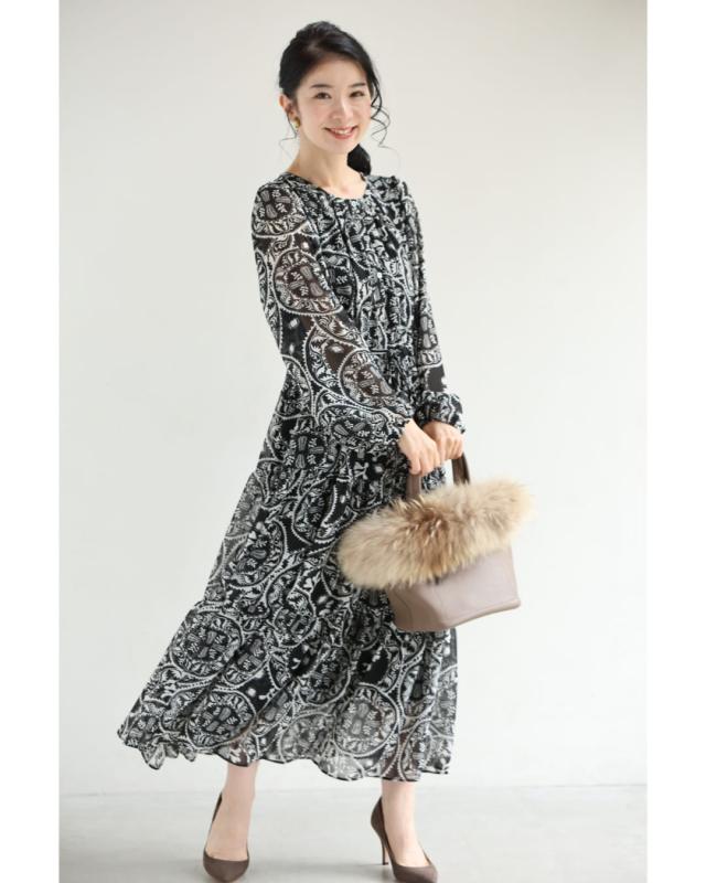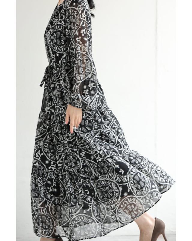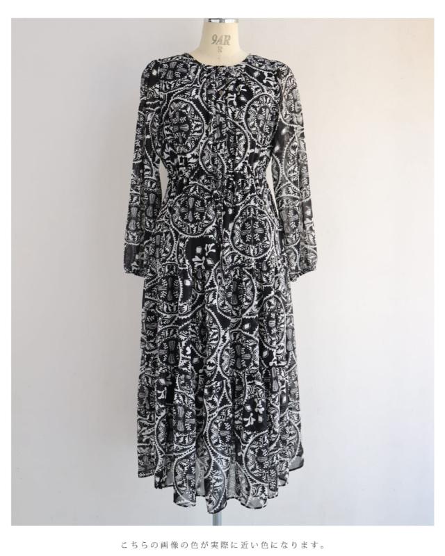 wkj00293 新作 新着 再入荷 CAWAII FRENCHPAVE フレンチパヴェ エレガント ベーシック カジュアル 可愛い かわいい カワイイ おしゃれ オシャレ お洒落 個性 個性的 定番 ベーシック 大人かわいい 大人可愛い 上品 女性らしい デザイン スタンダード ナチュラル きれいめ キレイめ シンプル フェミニン レディース レディースファッション 大人 ママ ミセス 30代 40代 50代 60代 黒 カレイドスコープ シフォン ミディアム ワンピース 長袖 ロング袖 透け感 シアー ふんわり ウエストマーク メリハリ S M L フリーサイズ フリー 小さめ 小さめサイズ小さい 小さいサイズ 低身長 痩せ ほっそり 小柄 細身 標準サイズ 大きめシルエット 大きい 大きめ ビッグシルエット ぽっちゃり F サイズ自由 秋 冬 秋服 秋物 冬服 冬物 体型カバー 楽ちん 楽チン ラクラク ブラック 黒色 ペイズリー柄 総柄 日常着 普段着 日常使い おでかけ 旅行 女子会 食事会 デート 買い物 大人女子