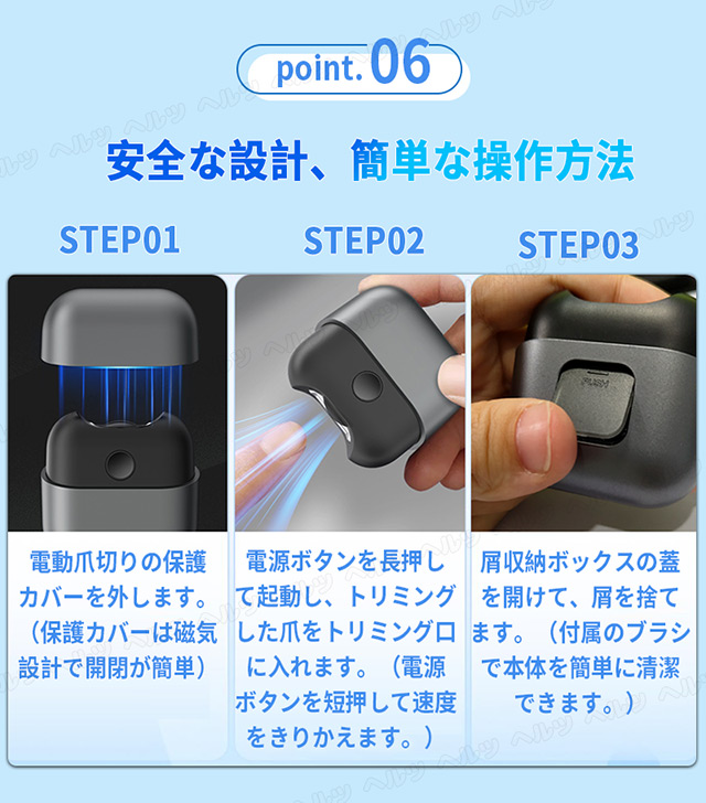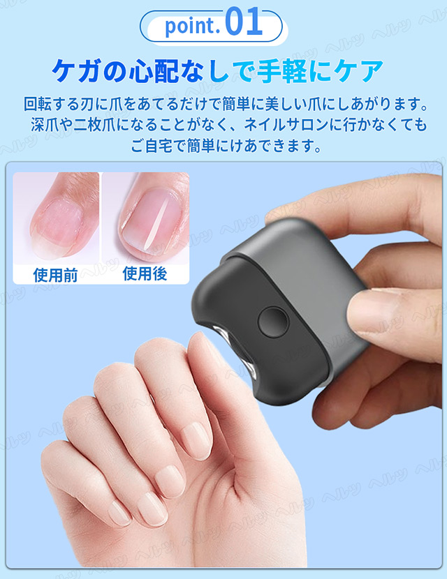 電動やすりは、先進のプロテクティブフェンス技術を採用されています。高品質合金で作られた螺旋状の刃が45°で高速回転し、爪を少しずつ優しく削るので、指を痛めることがありません。高性能モーターを搭載し、毎分最大3600回の超高速回転で、わずか数分で爪を切り終えられます。高齢者や子供など体力のない人でも、指を傷つける心配なく簡単に爪をきれいにすることができます。
