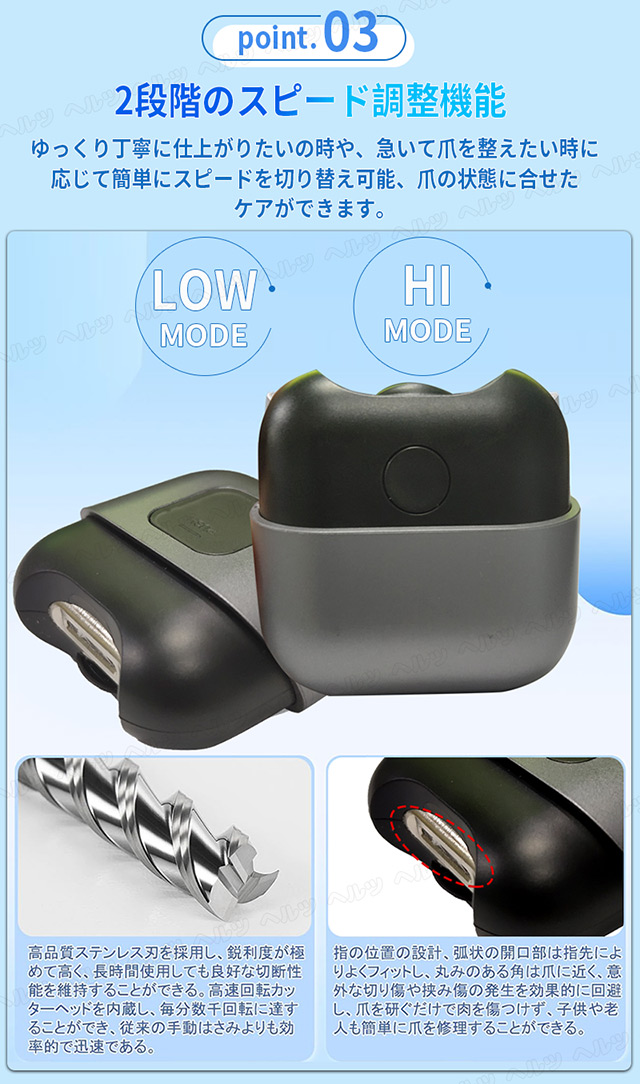 電動爪削り器は回転スピードを2つ持っています。スイッチボタンを押して回転速度を切り替え、1速は子供に適しており、2速は高齢者/若者にに適しています。爪切りは、すべての人に適した設計になっており、母親、父親、子供たちへの素晴らしい贈り物として、友人、同僚、上司、愛する人への贈り物以上のものです。