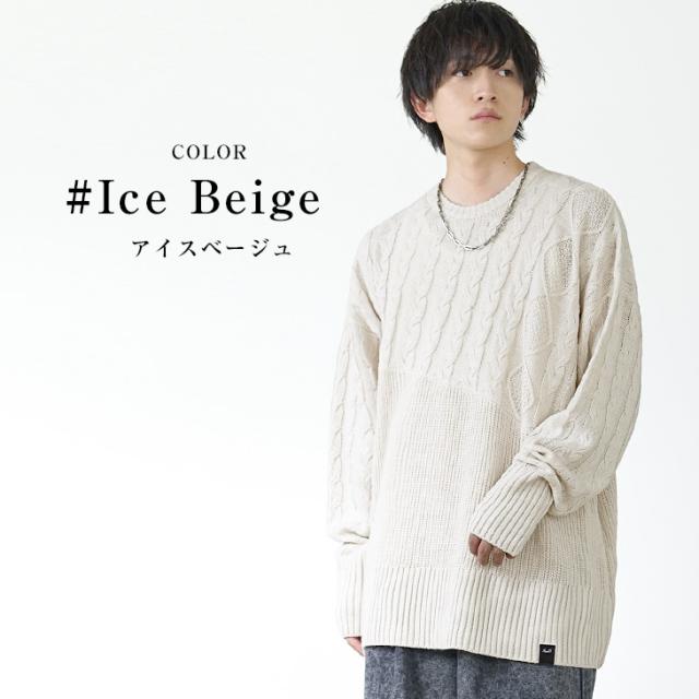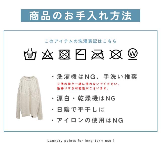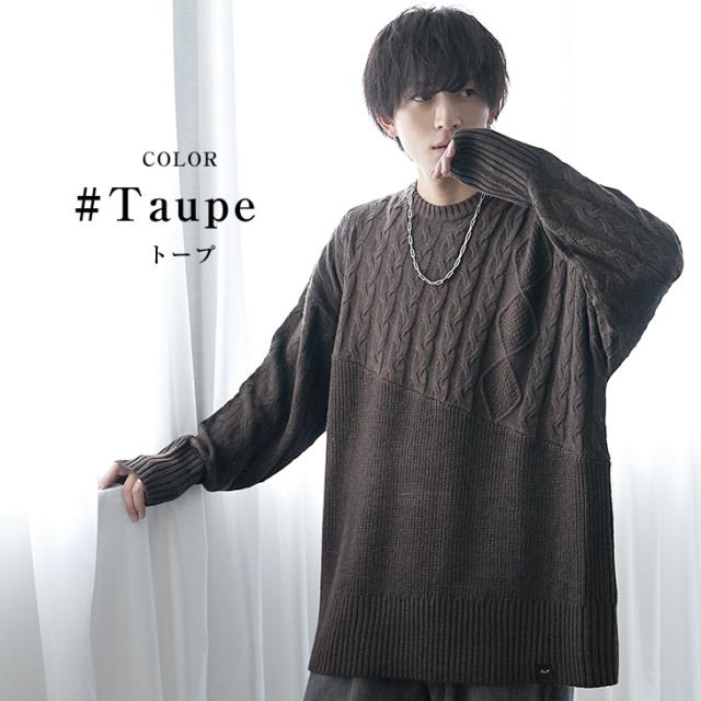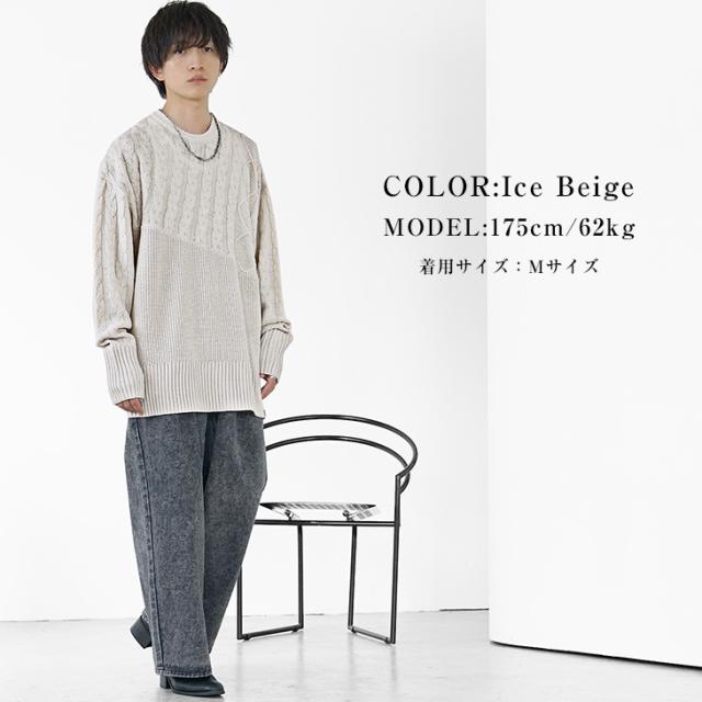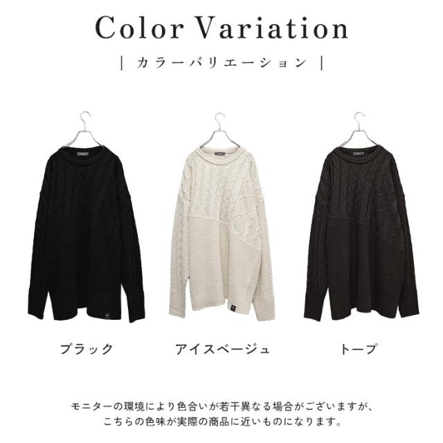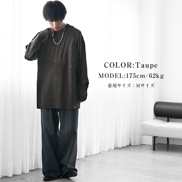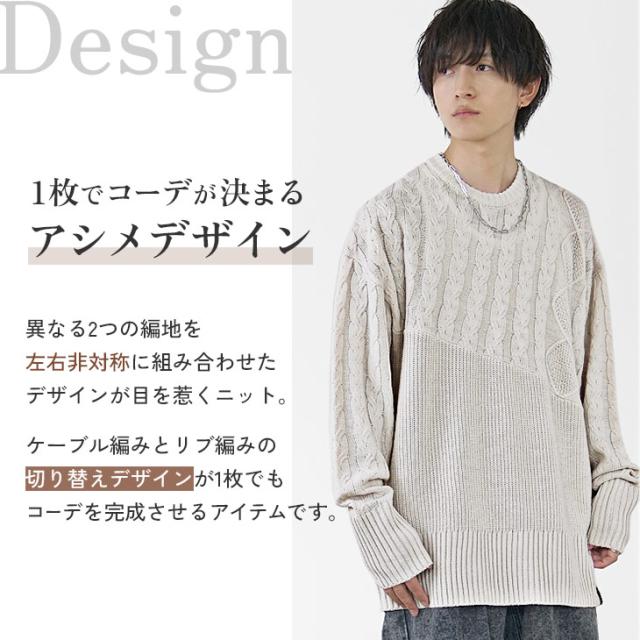 異なる2つの編地を左右非対称に組み合わせたニット。ケーブル編みとリブ編みの切り替えデザインが1枚でコーデを完成させます。お尻が隠れるほどのロング丈とリラックス感のある着心地です。ゆるっとしたシルエットがさり気なく体型カバーを叶えるアイテムです。