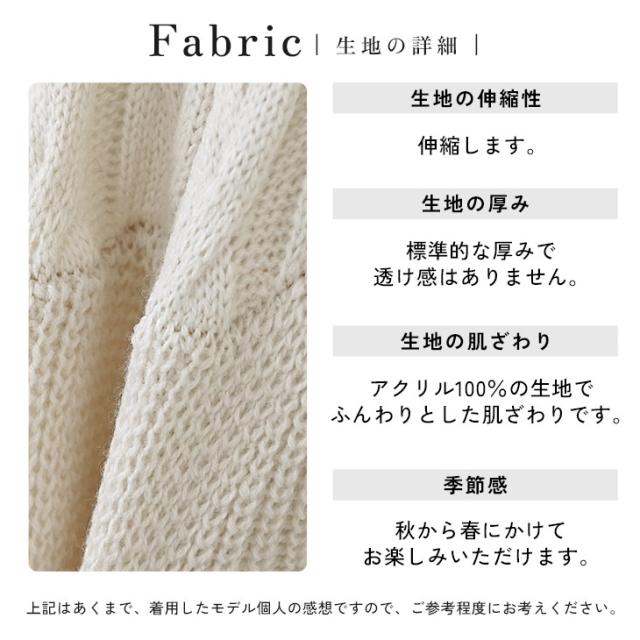 「ふんわり柔らかな肉厚ニット」程よく肉厚で、重みのあるアクリル素材のニット生地。毛玉防止と静電気軽減の加工を施し、ストレスフリーな着心地。ふんわりと柔らかくクセになる肌ざわりです。