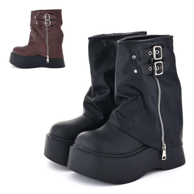 レディース ブーツ 厚底 おでこルーズブーツ カバーブーツ Y2K ミドルブーツ 7.5cmヒール デザインノート Design Note