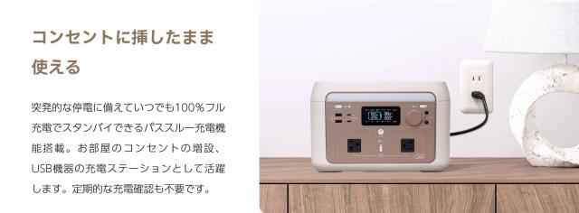 突発的な停電に備えていつでも100%フル充電でスタンバイできるパススルー充電機能搭載。お部屋のコンセントの増設、USB機器の充電ステーションとして活躍します。定期的な充電確認も不要です。