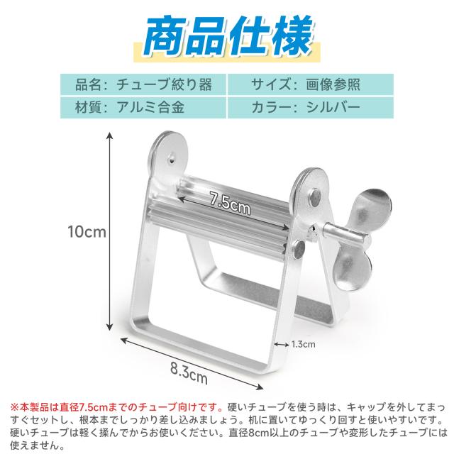 ※本製品は直径7.5cmまでのチューブ向けです。硬いチューブを使う時は、キャップを外してまっすぐセットし、根本までしっかり差し込みましょう。机に置いてゆっくり回すと使いやすいです。硬いチューブは軽く揉んでからお使いください。直径8cm以上のチューブや変形したチューブには使えません。