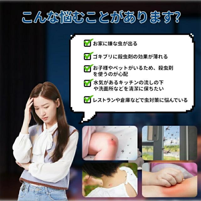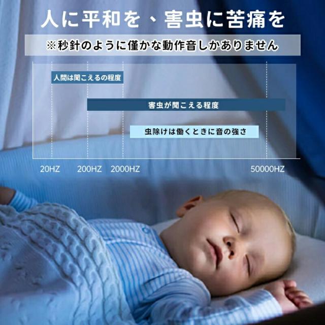 害虫にだけ効く超音波で、 内分泌と生理学機能を乱し、 害虫を寄せつけない効果を発揮! 超音波は人体やほかの動物には無害なので、安心です。