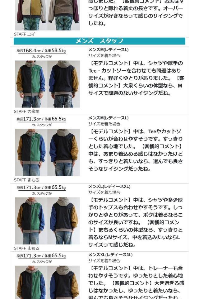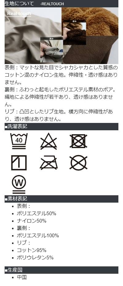 [素材]表側:ポリエステル50% ナイロン50% 裏側:ポリエステル100% リブ:コットン95% ポリウレタン5%