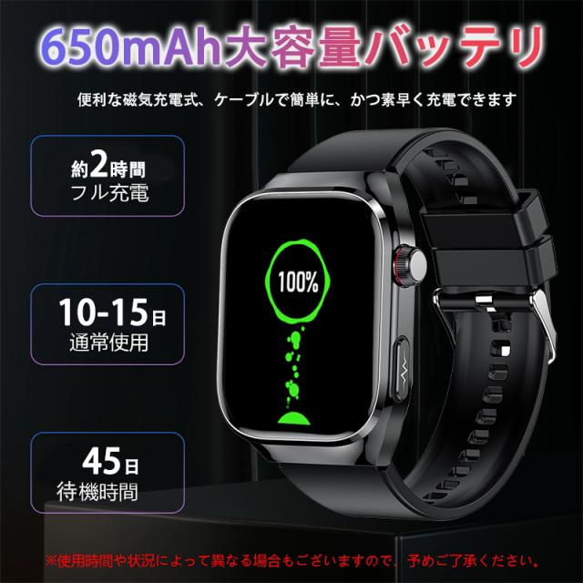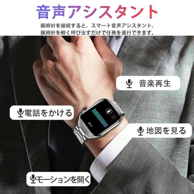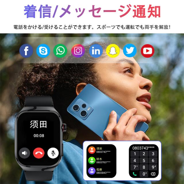 【Bluetooth5.1通話機能&音声アシスタント】スマートフォンとBluetooth接続すれば、電話の受信と応答を行うことができます。大切な電話を逃すことはありません。※※専用アプリと接続するとス マートウォッチで直接に電話をかけることや着信拒否も実現可能。運転中でも運動中でも両手を解放し、より効率的な通話ができます。音声アシスタント機能を搭載しており、スマートウォッチに話しかけるだけで音楽をかけてくれたり、アラームを設定してくれたり、スポーツモードを開始したりするなどの操作を実行できます。