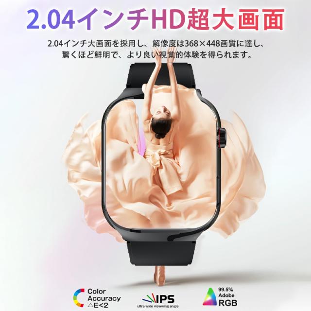 【2.04インチ大画面&多種類文字盤】HDの明瞭さで、健康とフィットネスの重要なデータを確認してください。3Dガラスの工芸に合わせて、より高い解像度の視覚体験とスマートフォンのようなタッチ触感を楽しめ、もっと便利に操作することができます。例のない快適な視覚感と優れた操作感をもたらし ます。多国の言語を自由に設定できます。更に、文字盤DIY機能もあり、携帯電話中の写真を利用して、お好きな文字盤を作る事もできます。毎日のお気持ちによって、新たな活力を注ぎます。好きな文字盤スタイルを取り替えましょう。