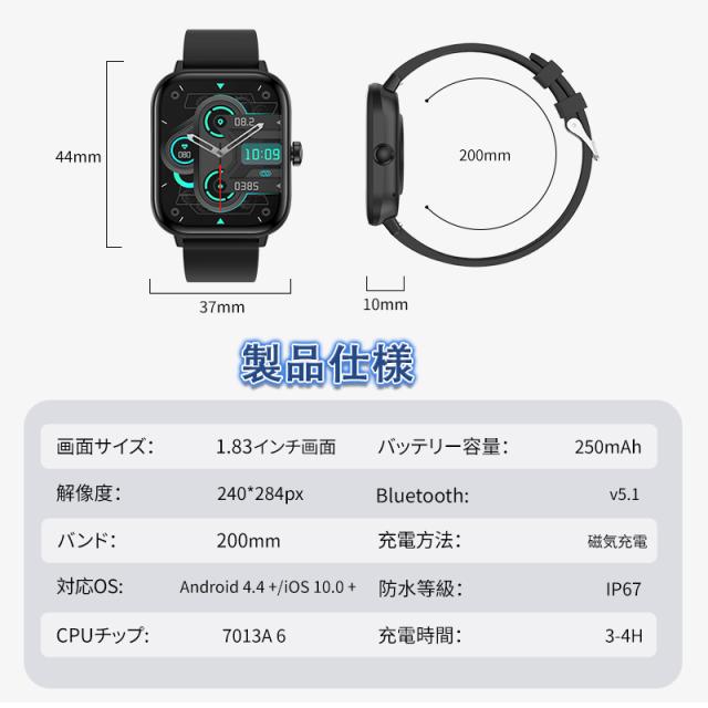 【1.83インチHD大画面&文字盤自由設定】1.83インチ大画面を採用して、驚くほど鮮明で、美しくリアルな画面を実現しました。画面の明るさ調節も可能で、強い日差し下にも視認性が高く、見やいです。フルタッチパネルを採用し、老眼の方にも見やすい! 本体の文字盤を搭載する以外、専用アプリで多種類文字盤を切り替えができるし、家族や恋人、アイドルなどの写真を文字盤の画面に変えることもできます。毎日のお気持ちによって、文字盤スタイルを取り替え可能。専用日本語取扱説明書を各機能や操作に記載させていただき、完全なるマニュアルがあるこそ安心できます!特に初心者や年配の方におすすめ!