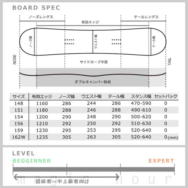 足下付近がキャンバー、センターはロッカーになった2つの乗り味を楽しめるWキャンバー形状。フリースタイル的な遊び感覚とパワフルな滑りをスムースに実現♪ 程よいルーズ感でロッカーの楽しさを持ちつつ、しっかり踏みこむことでキレのあるカービングもできるのでオールラウンドで楽しめる♪ フリーランからパークまで新しい技にチャレンジしやすい、初中級者にもオススメのオールラウンドモデル。 形状:ダブルキャンバー, ツインチップ, SW構造 |