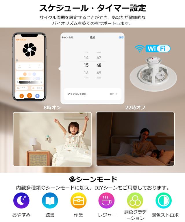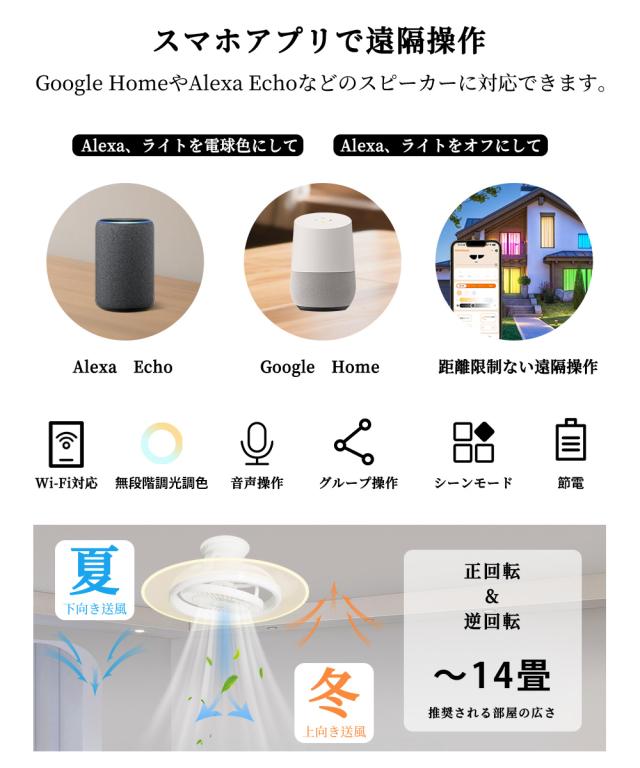 - 本製品は、ユーザーのニーズに応じて光の明るさと色温度を無段階で自由に調整できる機能を備えています。温かみのある黄光から明るい白光まで、様々なシーンに適した理想的な雰囲気を自在に作り出せます。同時に、風量調節機能も充実しており、柔らかな微風から強力な風力まで、多様な風速オプションを提供します。アプリ:無段階調光調色・風量調節/付属LCDリモコン:10段階調光調色・15段階風量調節