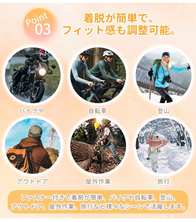 ファスナー付きで着脱が簡単、バイクや自転車、登山、アウトドア、屋外作業、旅行など様々なシーンで活躍します。