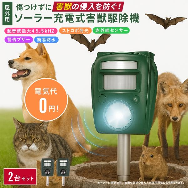ファミラ ソーラー充電式害獣駆除機 2個 超音波 センサー搭載 防水仕様 猫よけ 鳥よけ 動物撃退器 アラーム 光 音で撃退 庭 畑 駐車場 防犯 屋外設置 簡単 節電