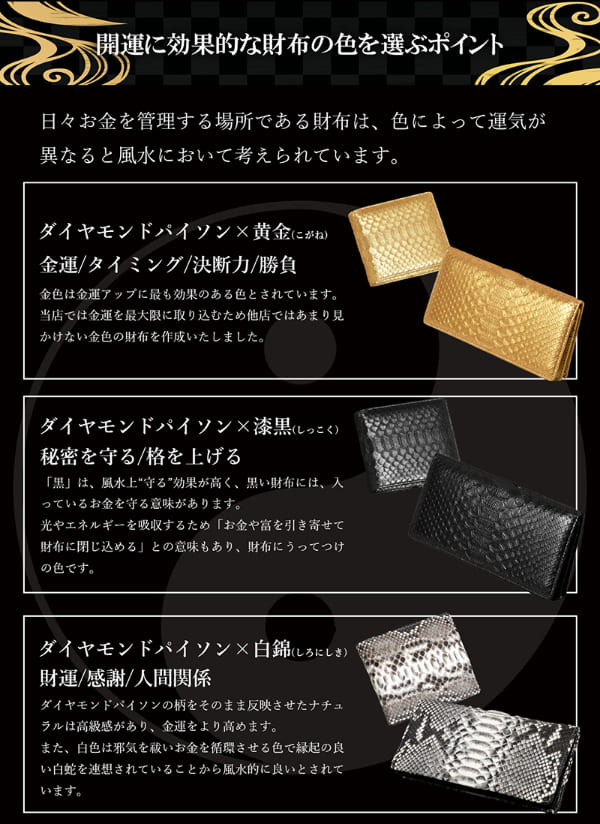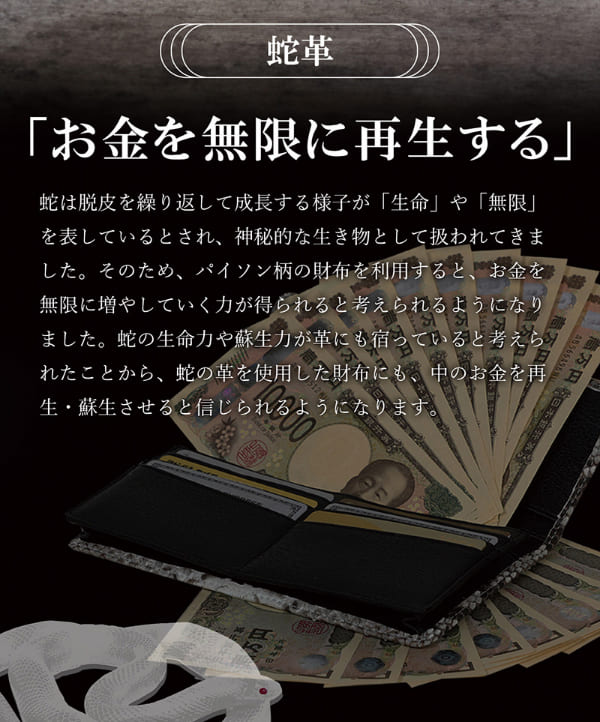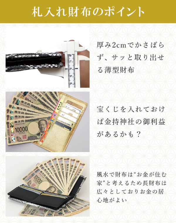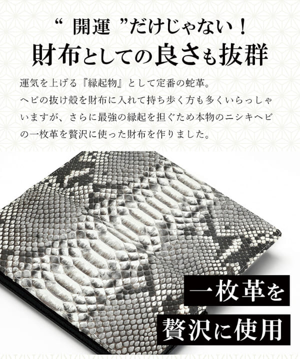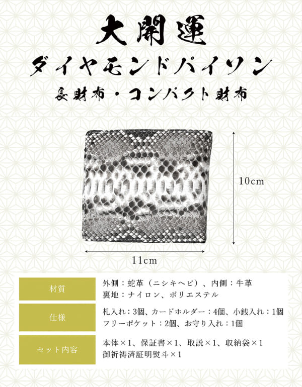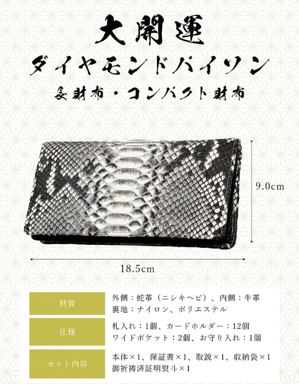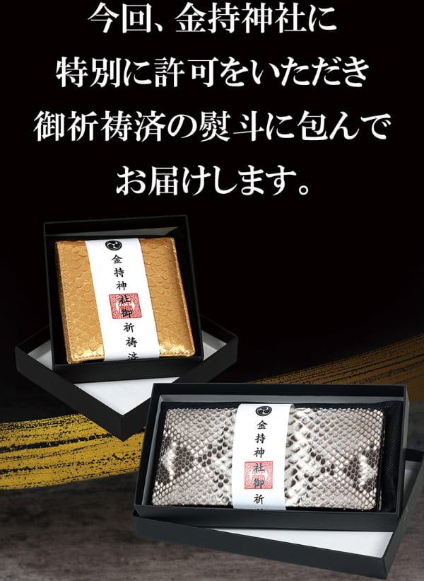金運アップで全国的に有名な「金持神社」で御祈祷した財布!■金持神社にて一粒万倍日に御祈祷をしてもらったダイヤモンドパイソンの財布です。蛇革×御祈祷×一粒万倍日を兼ね備えた金運財布といえます。■一粒万倍日とは一粒の籾(もみ)が万倍にも実り、立派な穂になる日本古来から伝わる開運の吉日。■蛇革は風水的にも良いとされ、古来より吉兆や縁起物として重宝されて来ました。■継ぎのない美しい一枚革を贅沢に使用しており、迫力と美しさを持った財布に仕上げております。■外側は本物ならではの刺々しい爬虫類の手触り。内側は使う程に手に馴染んでくる牛革とこだわり、程よい柔らかさを実現。■金持(かもち)神社!神坐す渓を祀る金運招福の神社。金持という縁起のいい地名は全国ここだけで商売繁盛や金運・開運を求め全国各地から多くの参拝者が訪れます。金持神社に許可をいただき、御祈祷済の熨斗に包んでお届けします。●厚み2cmでかさばらず、サッと取り出せる薄型財布となっております。●お守りや守り塩等、ちょっとした小銭を入れることのできるファスナーポケット付き。