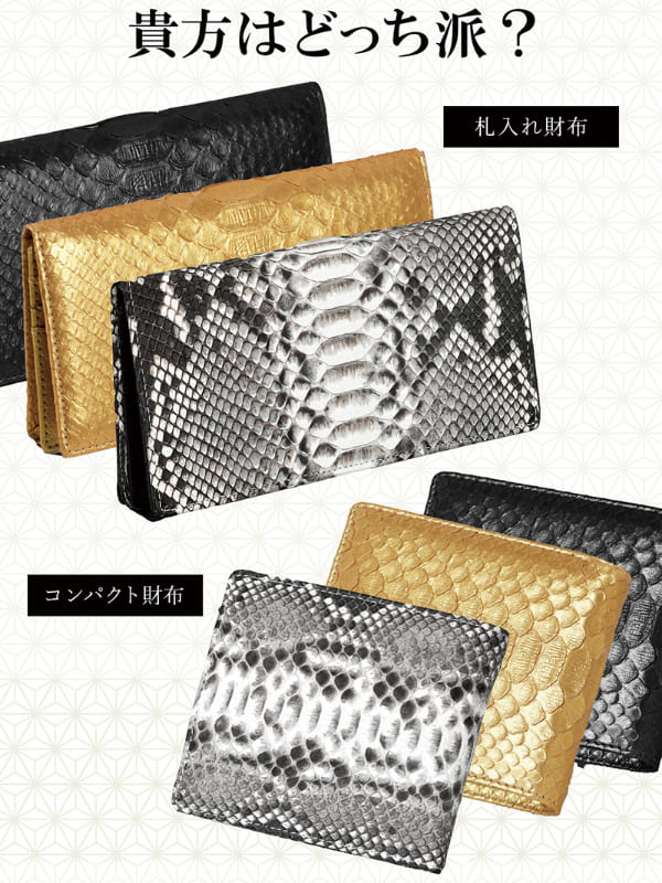 【カラー】白錦(しろにしき)、漆黒(しっこく)、黄金(こがね)【現品サイズ(約)】18.5×9×2cm【現品重量(約)】90g【材質】外側:蛇革(ニシキヘビ)、内側:牛革、裏地:ナイロン、ポリエステル【スペック】■留め具:かぶせ式(留め具なし)■札入れ:1個、カードホルダー:12個、ワイドポケット:2個、お守り入れ:1個■セット内容:本体×1、保証書×1、取説×1、御祈祷済証明熨斗×1、収納袋×1【生産国】ベトナム【ブランド】Costoroma(コストローマ)【注意事項】※この商品はワシントン条約【CITES】の規定に基づき輸入された養殖原皮のみを使用しております。※染色以外の手を加えていない本物のパイソン皮を使用している為、1点1点、斑紋や色味など微妙に柄が異なります。