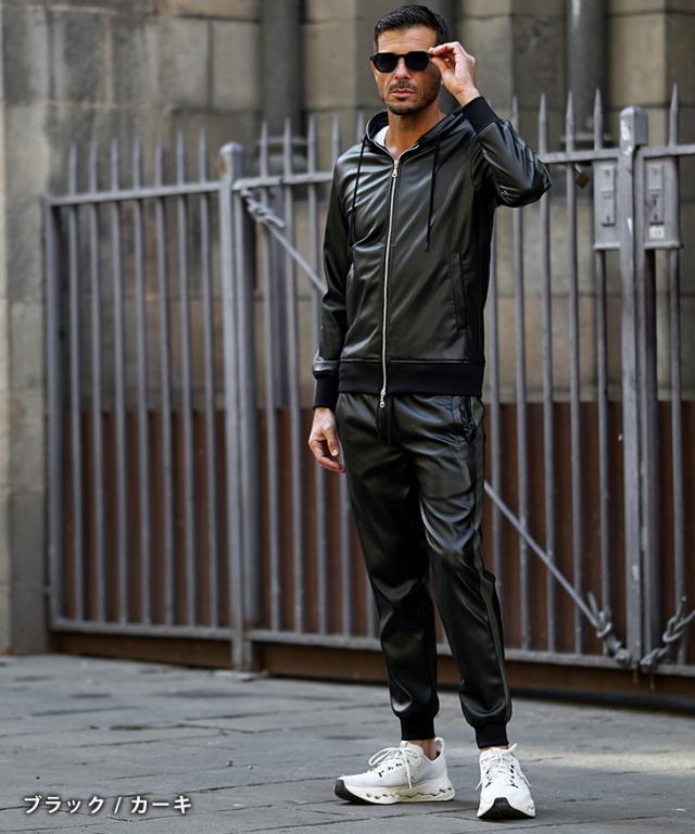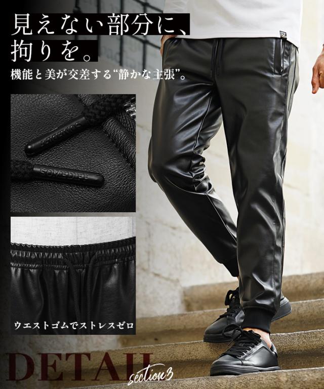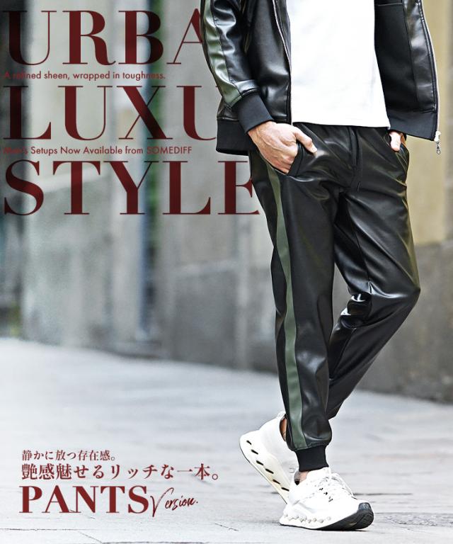 SOMEDIFF(サムディフ)『PUレザージョガーパンツ』【PUレザージョガーパンツ】■Design/デザイン上品な光沢が、足元から大人の色気を漂わせるPUレザージョガーパンツ。ウエストはゴム仕様でフィット感があり、ドローコードでサイズ調整も自在。裾リブがシルエットを引き締め、細身のラインが脚をすっきりと見せてくれます。サイドポケットを備え、デザイン性と実用性を兼ね備えた一本。合わせるだけで、洗練された男らしさを演出する、存在感のあるジョガーパンツです。