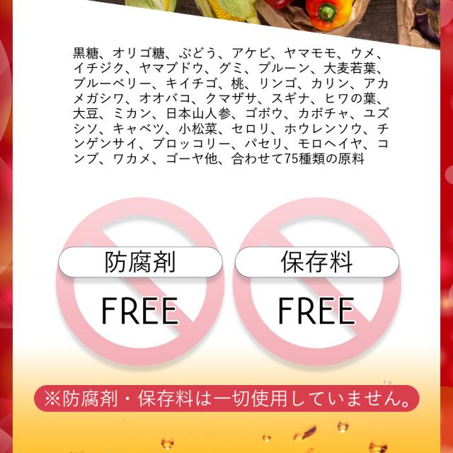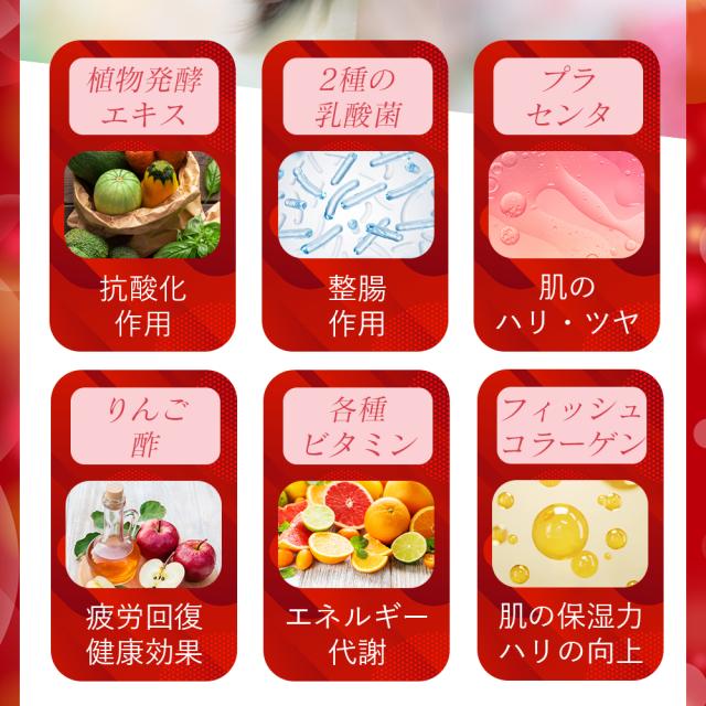 | 原材料名 | イソマルトオリゴ糖液糖(国内製造)、りんご酢、植物発酵エキス、フラクトオリゴ糖液糖、りんご果汁、いちご果汁、乳酸菌末(殺菌)、フィッシュコラーゲンペプチド、エクソソーム含有プラセンタ・サイタイ・羊膜エキス/酸味料、香料、甘味料(ステビア)、ビタミンB1、ビタミンC、ビタミンB2、ビタミンB6、ビタミンE、ビタミンA、ビタミンB12、(一部にキウイフルーツ・大豆・もも・りんご・ゼラチンを含む) |