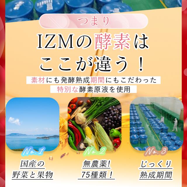 | 商品説明 | IZMシリーズから免疫ケア酵素ドリンクが新登場 IZMシリーズは瀬戸内産植物発酵エキスや果物・植物素材にこだわり、毎日続けやすい、飲みやすいをコンセプトに生まれた商品です。 1,000億個の乳酸菌で健康習慣を! IZM STRAWBERRY TASTE(イズム ストロベリーテイスト)は瀬戸内産にこだわった75種類の野菜や果物を3年6ヶ月発酵させた植物エキス配合のイチゴ味の免疫ケア酵素ドリンクです。 コップ1杯(原液40ml)に合計1,000億個の2種類の乳酸菌(EC-12株とnanoECF-M株を各500億個)と各種ビタミンを贅沢に配合しております。 さらに、栄養機能食品としてビタミンB1を配合することで、腸内環境の改善や健康維持をより効果的にサポートします。 美味しいから続けられる 酵素ドリンクってどんなイメージがありますか?一度飲みにくさを感じてしまうと毎日の習慣として続けるのは難しいものです。「美味しいから無理なく手軽に続けやすい」「これなら子供も飲みやすい」そんな仕上がりを追求し、IZMが生まれました。 |