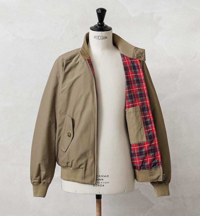 英国陸軍の支給用ジャンパーをベースにしたスイングトップ ジャケット「G9」。コットンブルゾンの定番でありBARACUTAの名品とも呼べるモデルが登場しました。高密度のポリエステル/コットンの混紡素材にテフロン加工を施し、撥水、防泥機能に優れた表地、動きやすいラグランスリーブ、ドッグイヤーカラー、雨滴を流し、通気性を良くするアンブレラバックヨーク、 そしてバラクータの特徴であるフレイザータータンの裏地。防風性を高める袖と裾のリブによって、全体のシルエットが引き締まり、カジュアルになりすぎない仕様になっています。