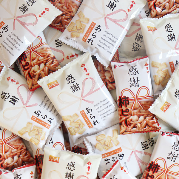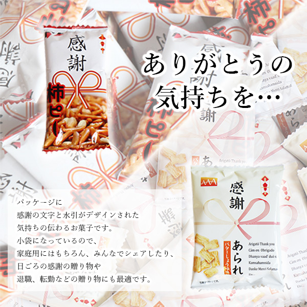パッケージに感謝の文字がデザインされた「感謝あられ」と「感謝柿ピー」の詰め合わせです。