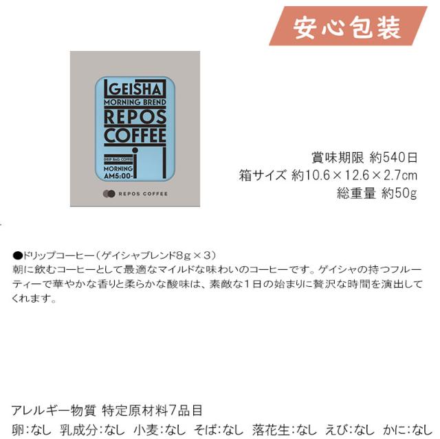 』 ●ドリップコーヒー(ゲイシャブレンド8g×3) 朝に飲むコーヒーとして最適なマイルドな味わいのコーヒーです。ゲイシャの持つフルーティーで華やかな香りと柔らかな酸味は、素敵な1日の始まりに贅沢な時間を演出してくれます。 箱サイズ 約10.6×12.6×2.7cm 総重量 約50g 賞味期限 約540日 アレルギー物質 特定原材料7品目 卵:なし 乳成分:なし 小麦:なし そば:なし 落花生:なし えび:なし かに:なし ■さまざまなギフトアイテムをご用意しております。 お気軽にお問い合わせください。 内祝 内祝い お祝い返し ウェディングギフト ブライダルギフト 引き出物 引出物 結婚引き出物 結婚引出物 結婚内祝い 出産内祝い 命名内祝い 入園内祝い 入学内祝い 卒園内祝い 卒業内祝い 就職内祝い 新築内祝い 引越し内祝い 快気内祝い 開店内祝い 二次会 披露宴 お祝い 御祝 結婚式 結婚祝い 出産祝い 初節句 七五三 入園祝い 入学祝い 卒園祝い 卒業祝い 成人式 就職祝い 昇進祝い 新築祝い 上棟祝い 引っ越し祝い 引越し祝い 開店祝い 退職祝い 快気祝い 全快祝い 初老祝い 還暦祝い 古稀祝い 喜寿祝い 傘寿祝い 米寿祝い 卒寿祝い 白寿祝い 長寿祝い 金婚式 銀婚式 ダイヤモンド婚式 結婚記念日 ギフト ギフトセット セット 詰め合わせ 贈答品 お返し お礼 御礼 ごあいさつ ご挨拶 御挨拶 プレゼント お見舞い お見舞御礼 お餞別 引越し 引越しご挨拶 記念日 誕生日 父の日 母の日 敬老の日 記念品 卒業記念品 定年退職記念品 ゴルフコンペ コンペ景品 景品 賞品 粗品 お香典返し 香典返し 志 満中陰志 弔事 会葬御礼 法要 法要引き出物 法要引出物 法事 法事引き出物 法事引出物 忌明け 四十九日 七七日忌明け志 一周忌 三回忌 回忌法要 偲び草 粗供養 初盆 供物 お供え お中元 御中元 お歳暮 御歳暮 お年賀 御年賀 残暑見舞い 年始挨拶 話題 のし無料 メッセージカード無料 ラッピング無料 手提げ袋無料 大量注文
