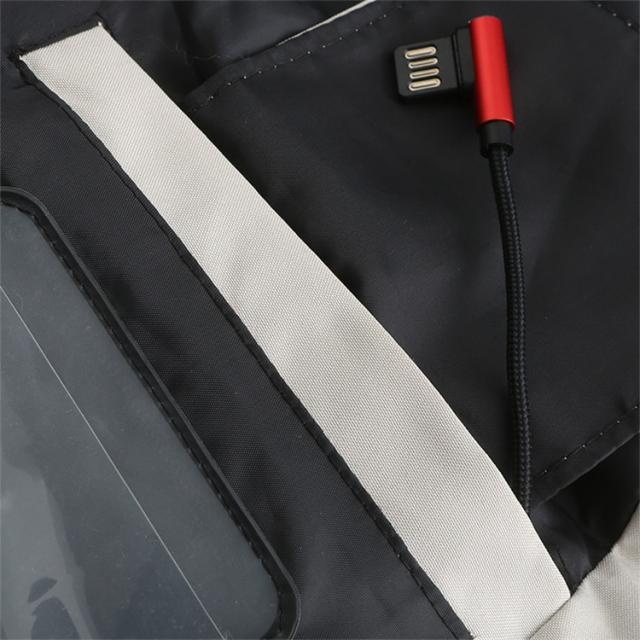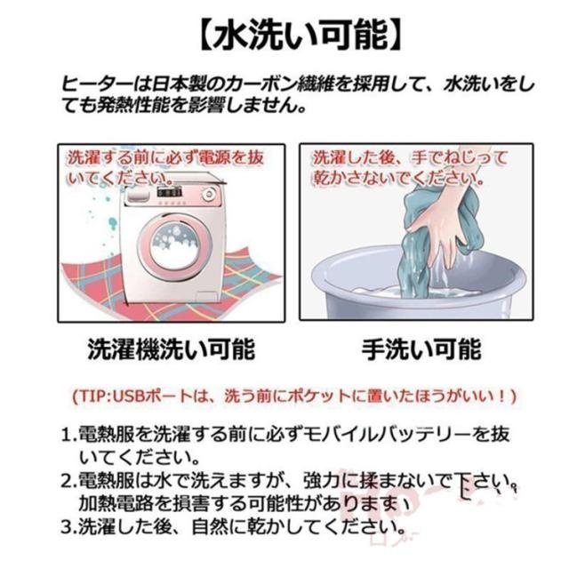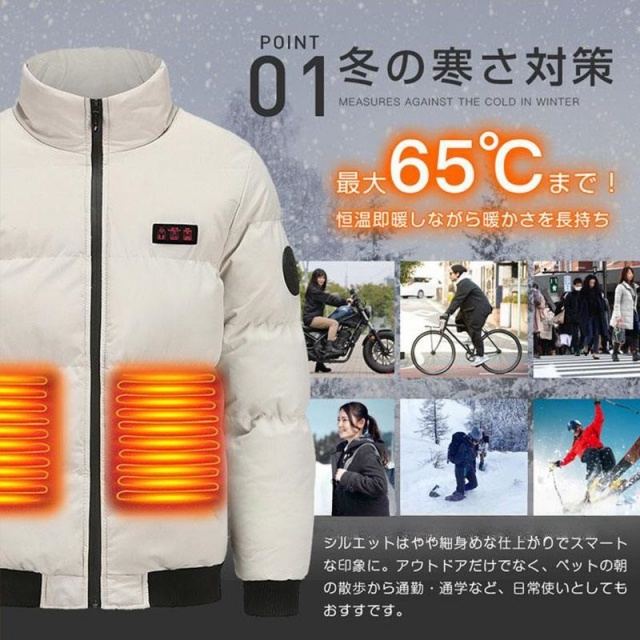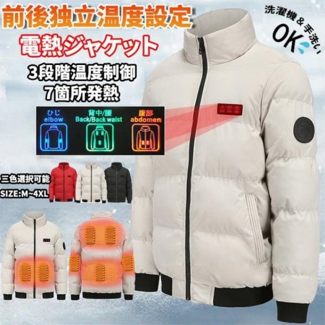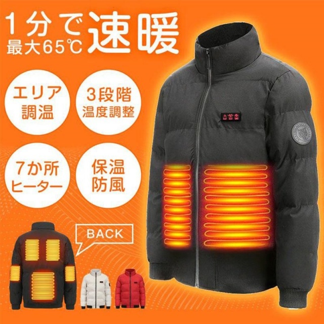 ポイント:防水(外出用最適)7つヒーター内蔵(肘、腹、背中部位)、フード隠し収納可、3段階温度調節、水洗い可、USB接続充電式、
