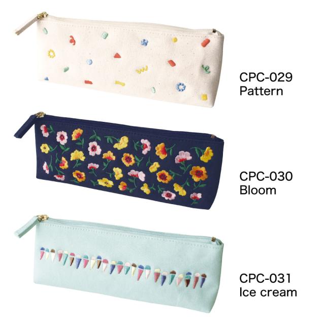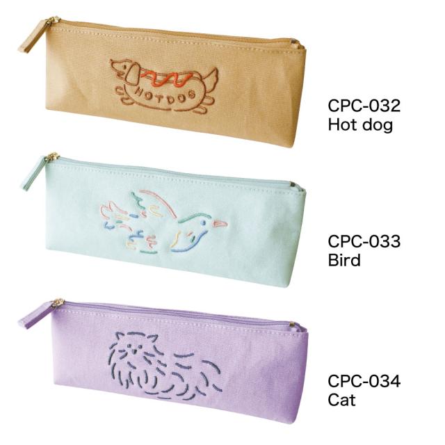帆布のしっかりとした生地に、ユーモラスで個性あふれる刺繍をあしらったペンケース。