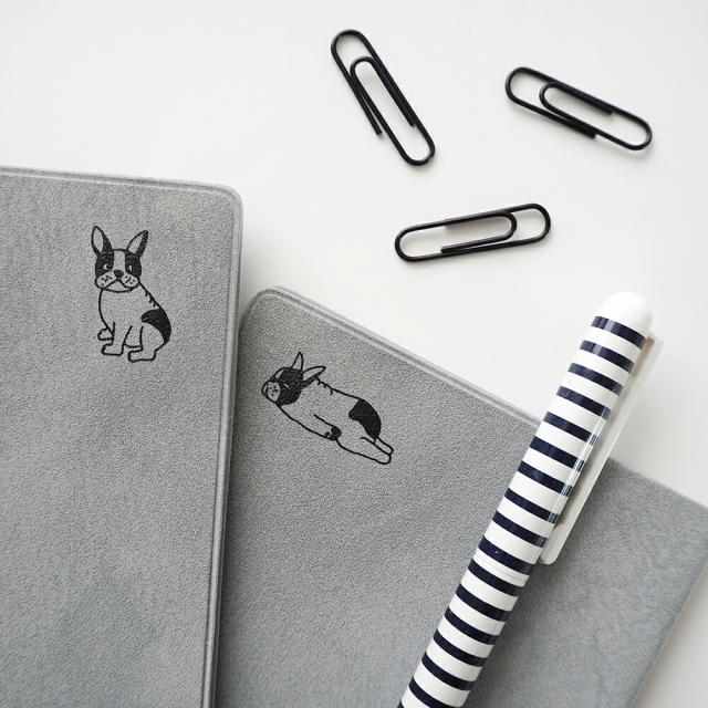 フレンチブルの裏面は ぐて?っと腹ばいポーズ。