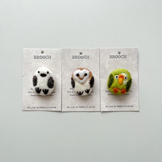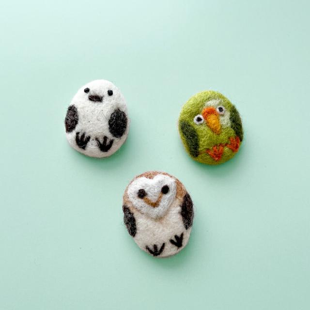 シマエナガ、フクロウ、インコのふんわり可愛らしいフェルトブローチです。