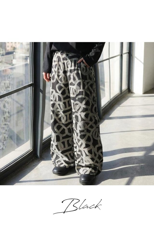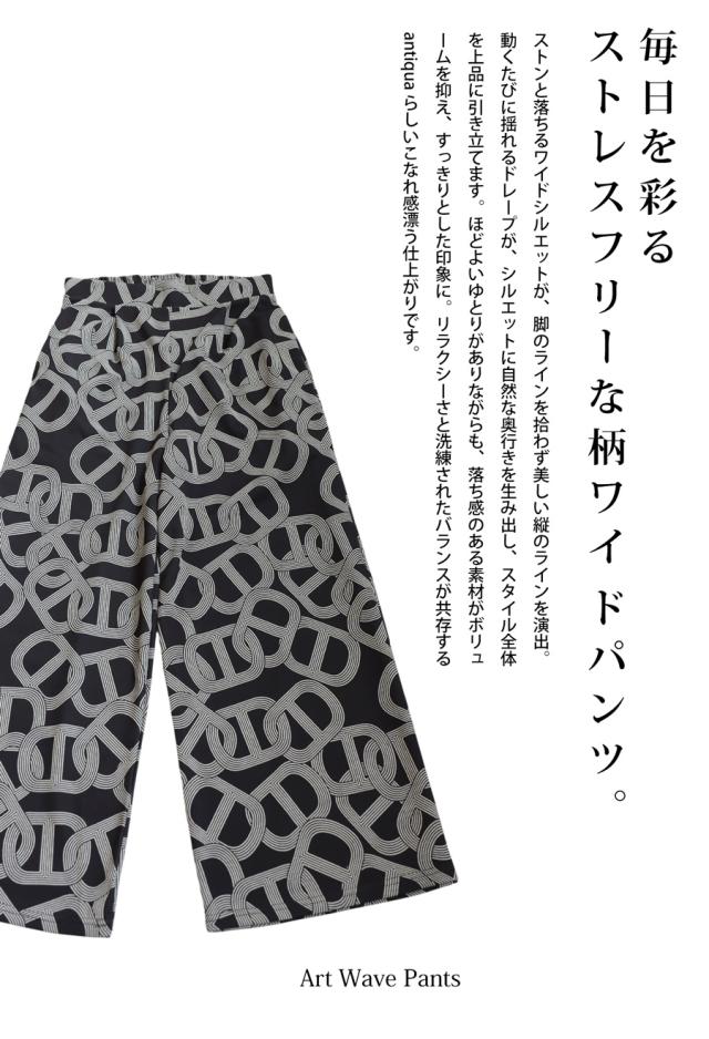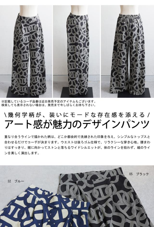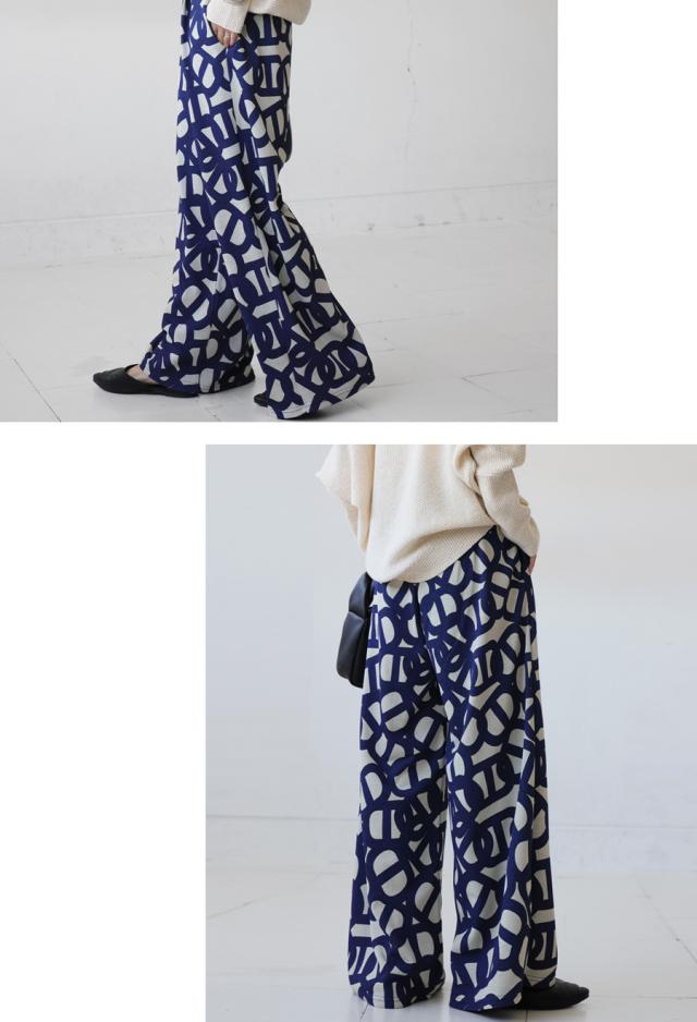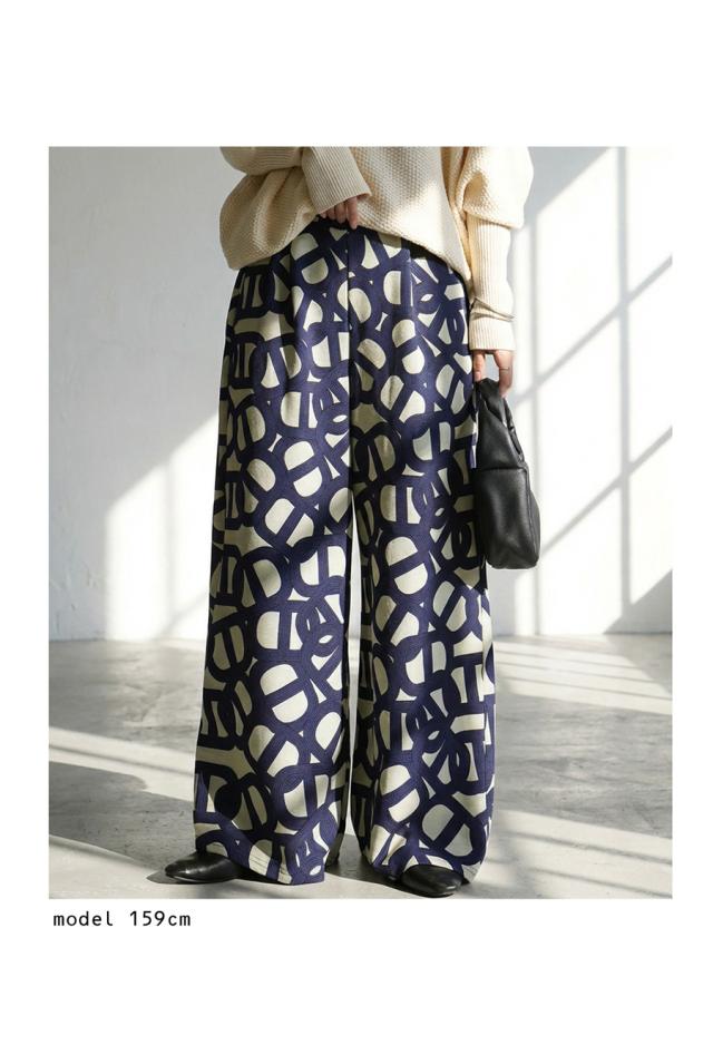 pa-03880 ロングパンツ ワイド 幾何学 柄 ワイドストレート おしゃれ 体型カバー 楽ちん ウエストゴム 美シルエット ゆったり リラックス 着回し 柄パンツ アート スラックス