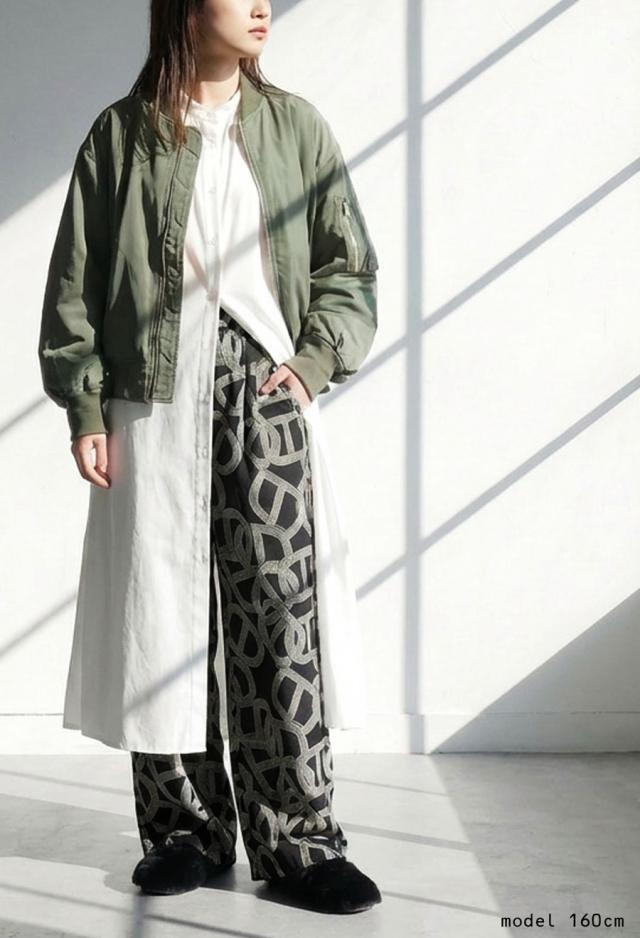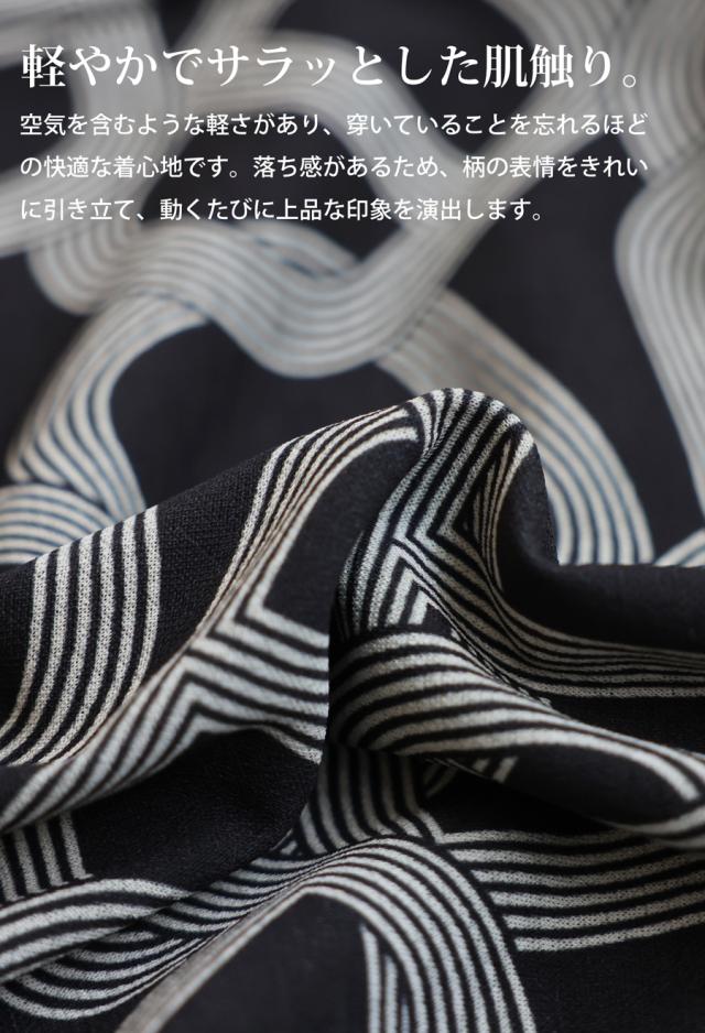落ち感のある素材が柄の美しさを際立たせ、動くたびに洗練された印象を演出します。