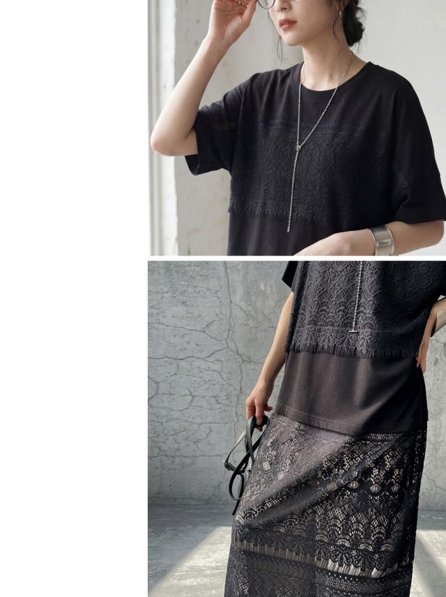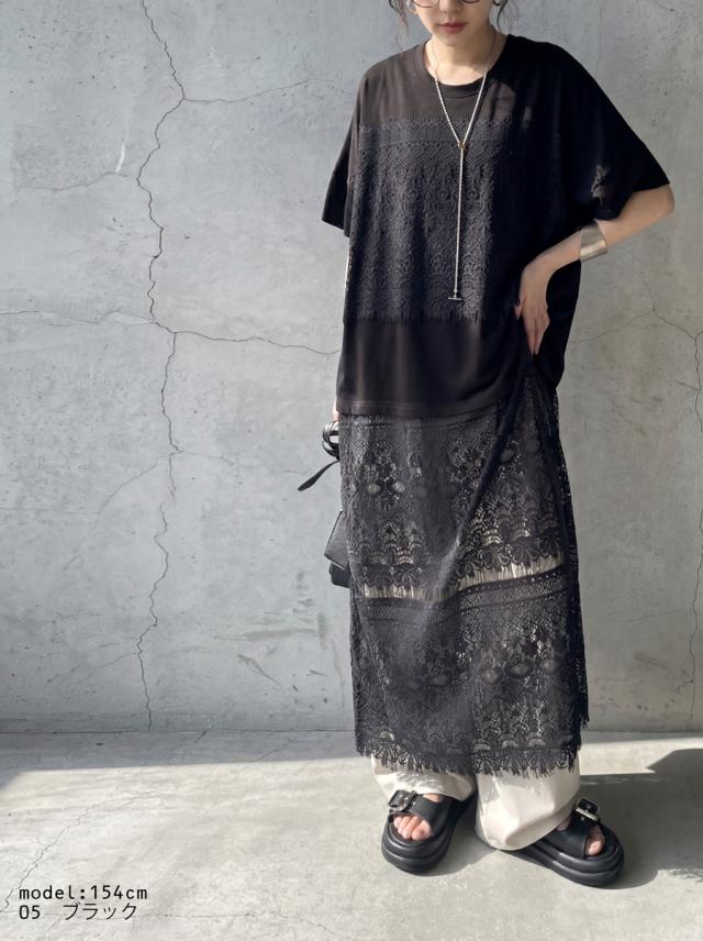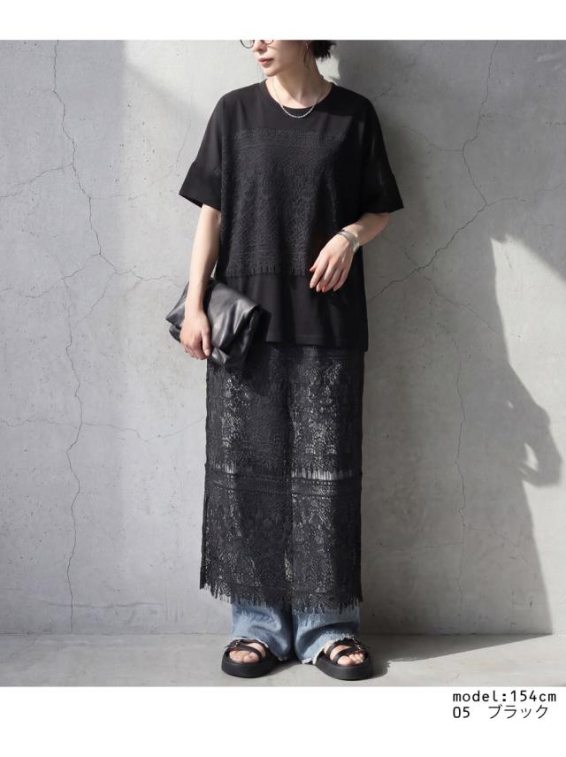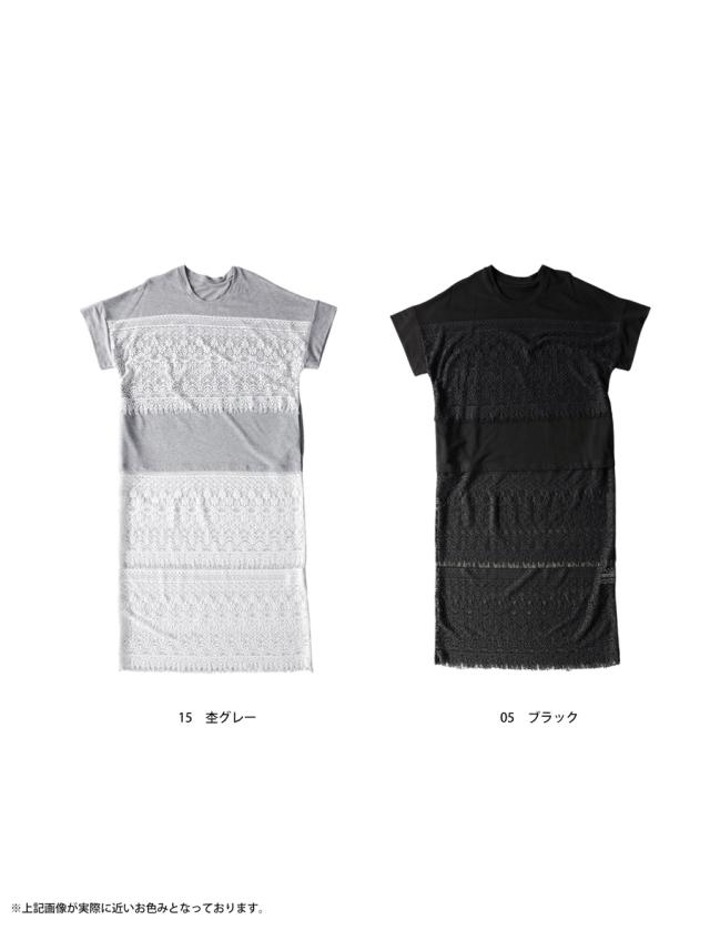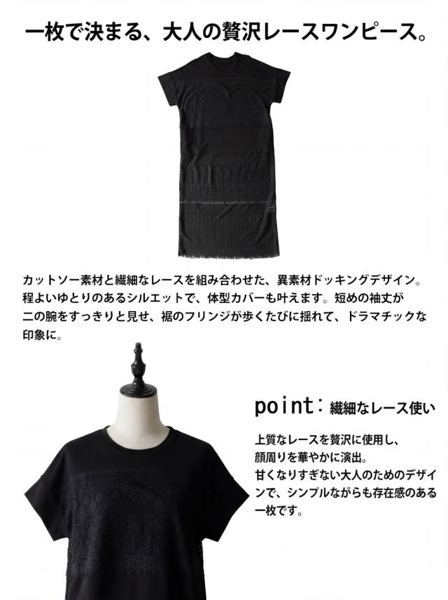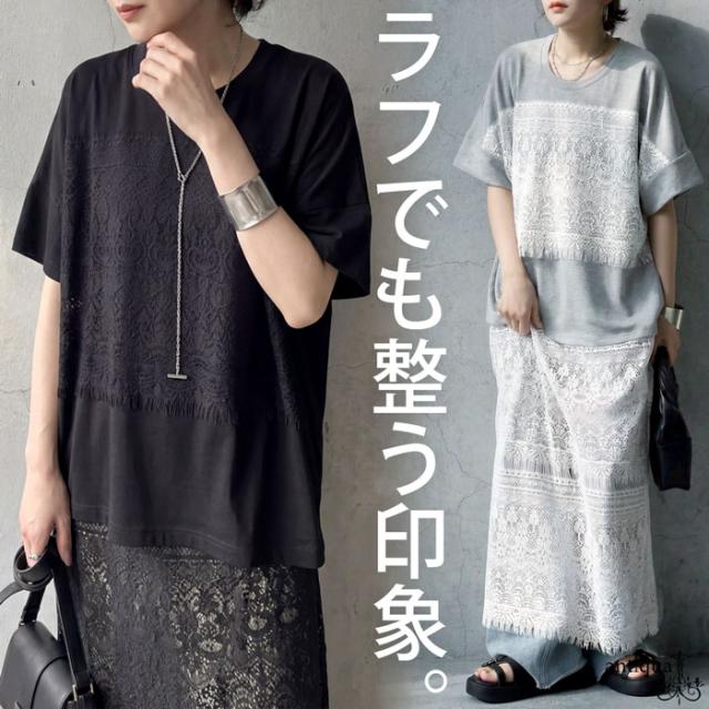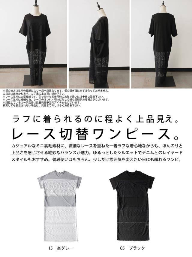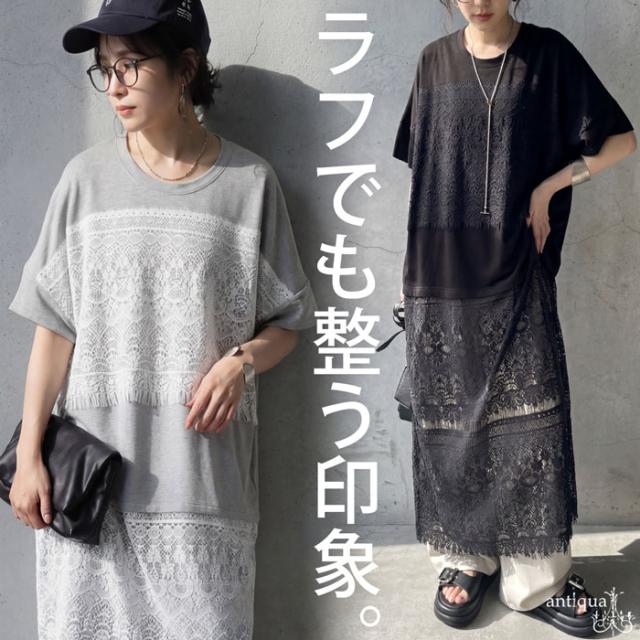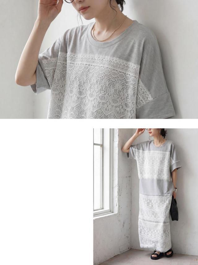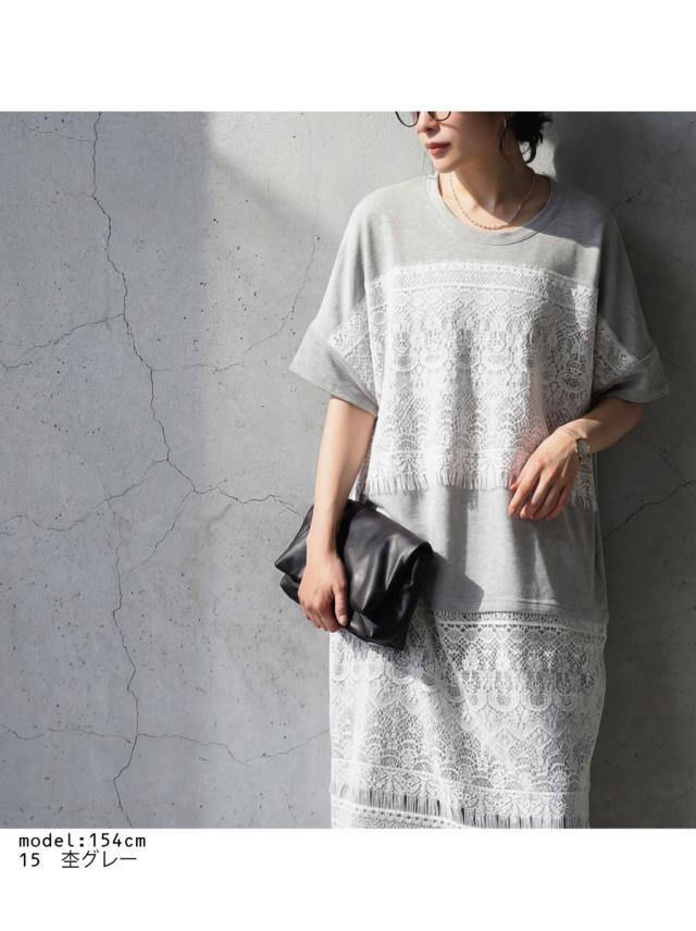 pa-03889 ワンピース 半袖ワンピ レース切替 Iライン クルーネック ストレートシルエット ミニ裏毛 カットソーワンピ ゆったり 体型カバー 大きいサイズ カジュアル 上品 こなれ