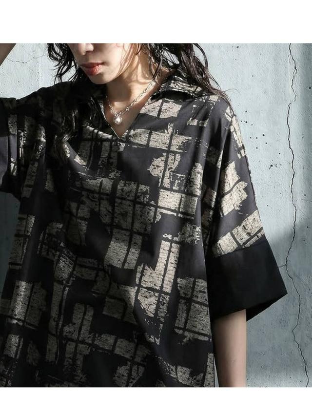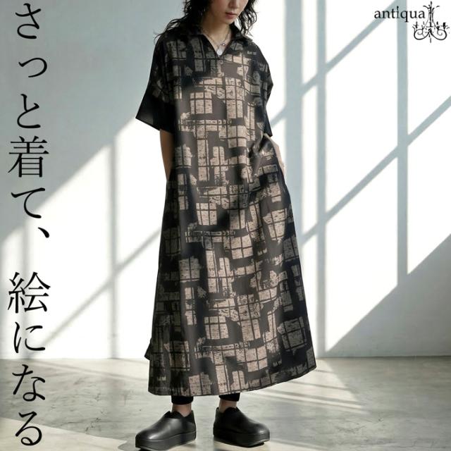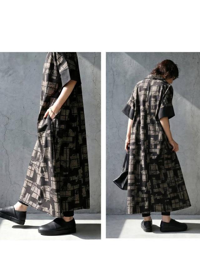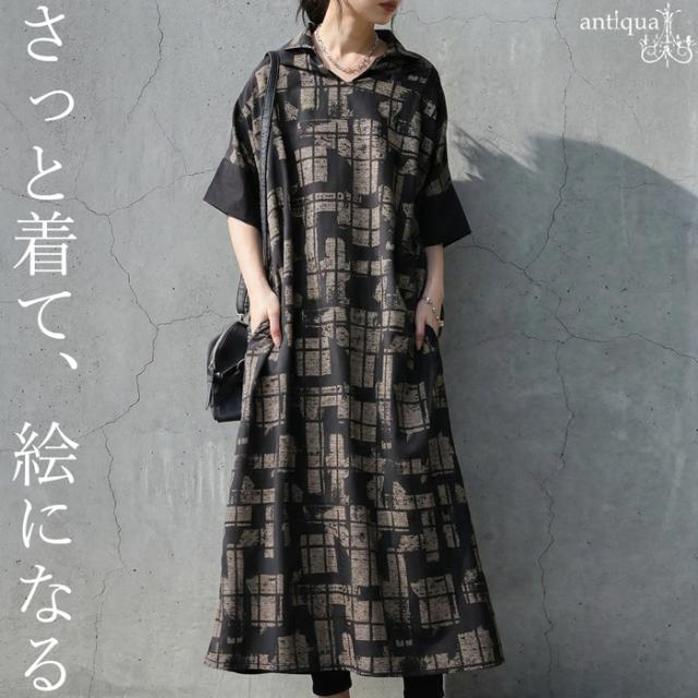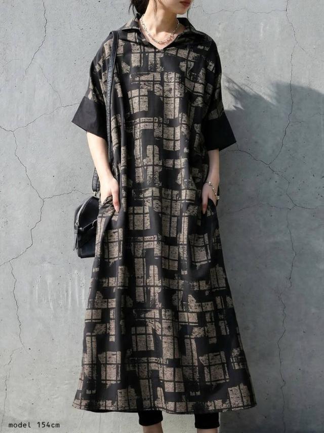 pa-03900 ミモレ丈 Aラインシルエット ワンピ 柄ワンピース 総柄 デザインワンピース モード 抽象柄 幾何学プリント 配色切替 レギュラーカラー プルオーバー レイヤード ゆったり