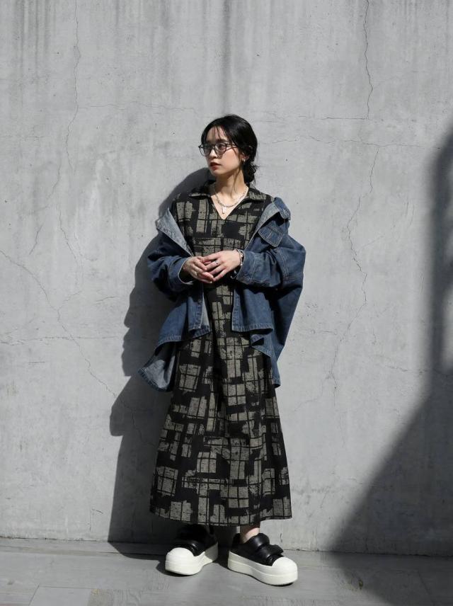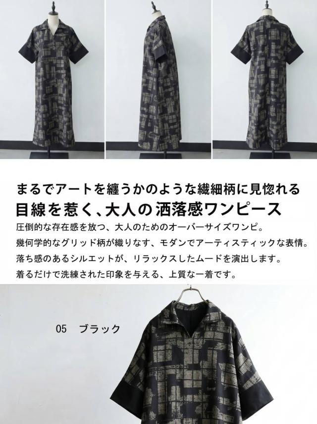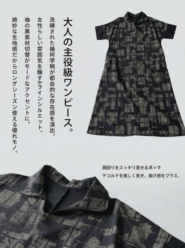 幾何学プリントが目を惹く総柄のワンピースで、存在感のあるモードなデザインに仕上げました。