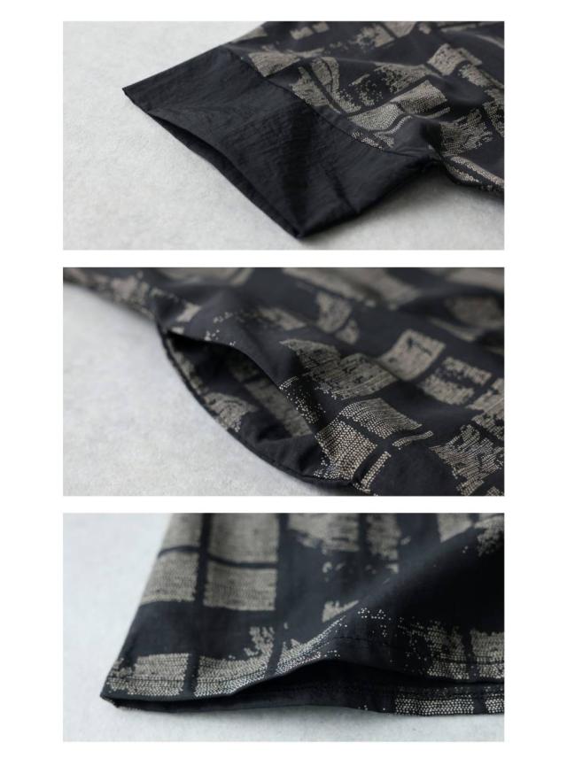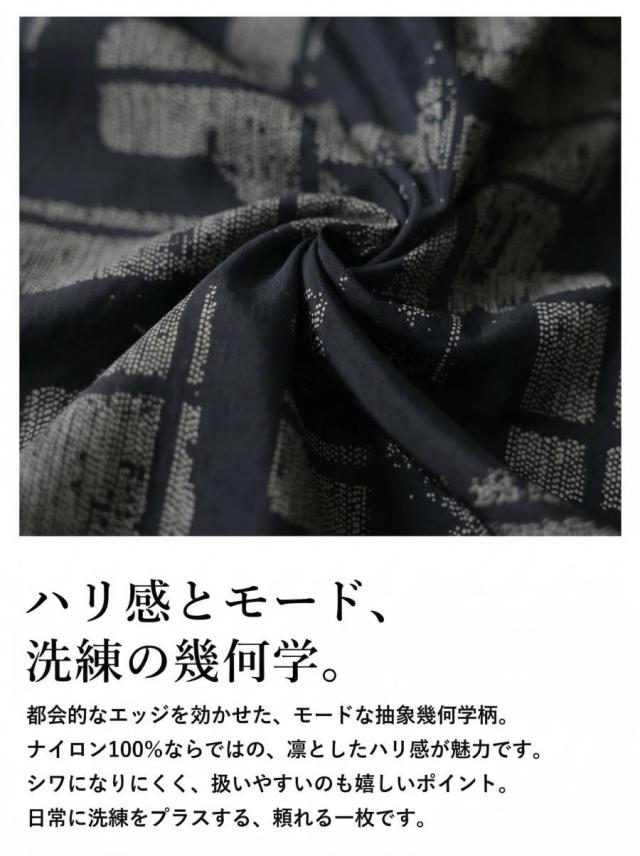 ハリ感のある生地が美しいシルエットを保ち、抽象柄(幾何学柄・幾何学プリント)のデザインが都会的なモードスタイルを演出します。