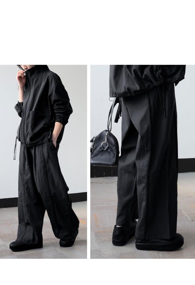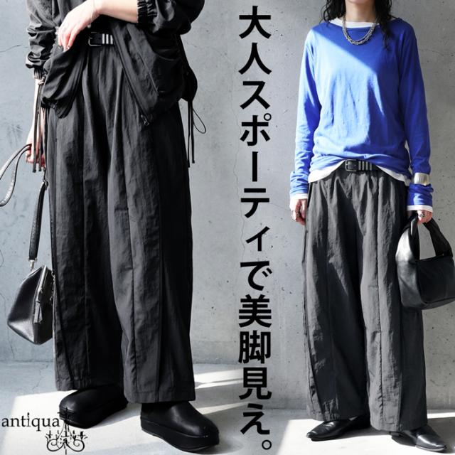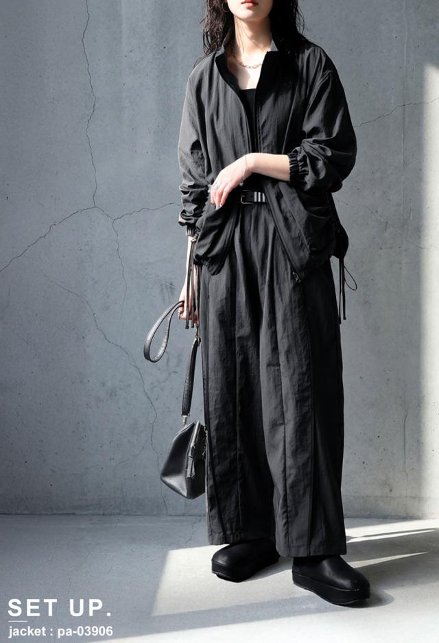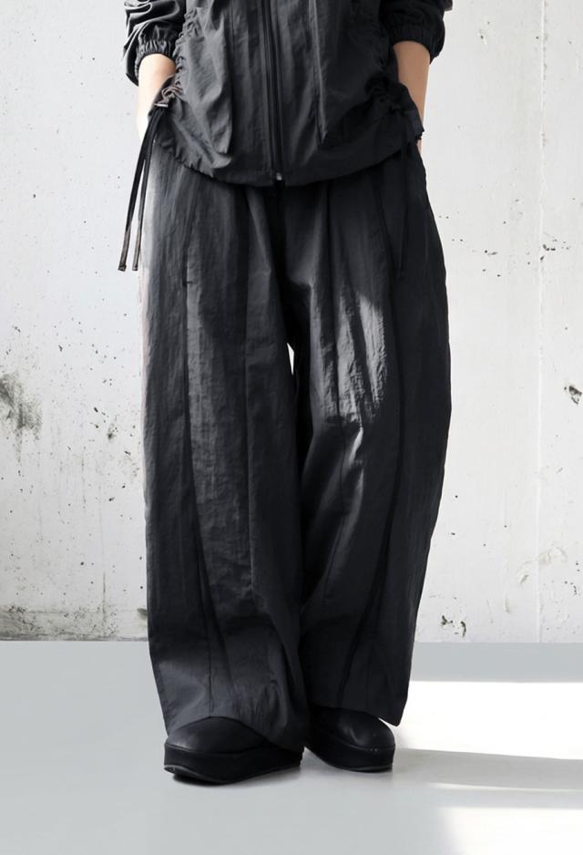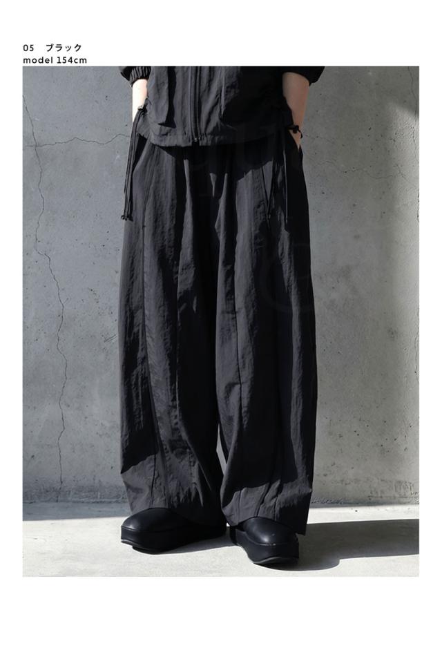pa-03907 ボトムス パンツ ワイド ロング 軽い ナイロンパンツ ワイドストレート ライン ウエストゴム 紐付き スポーティ 楽ちん モード 無地 シンプル 美脚 細見え 動きやすい