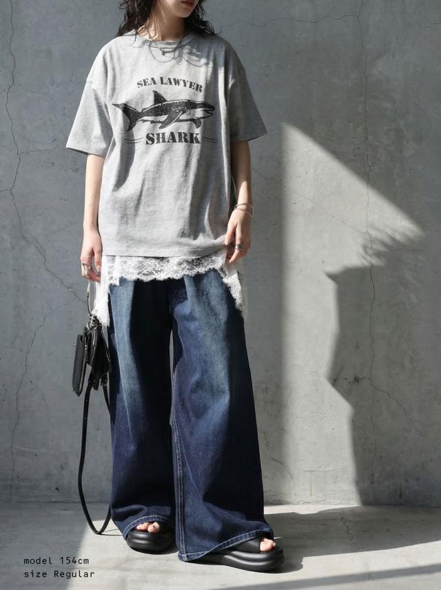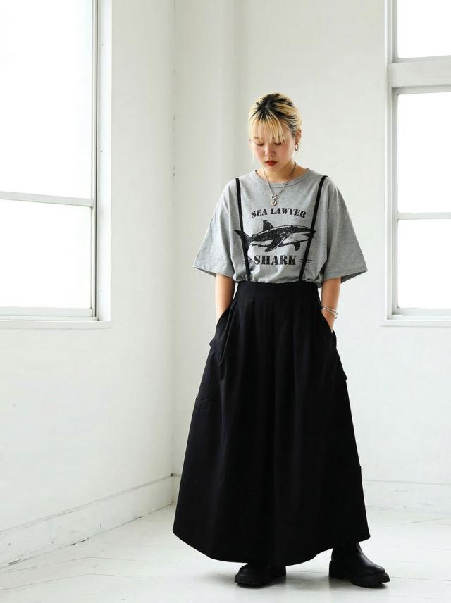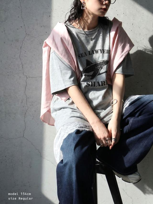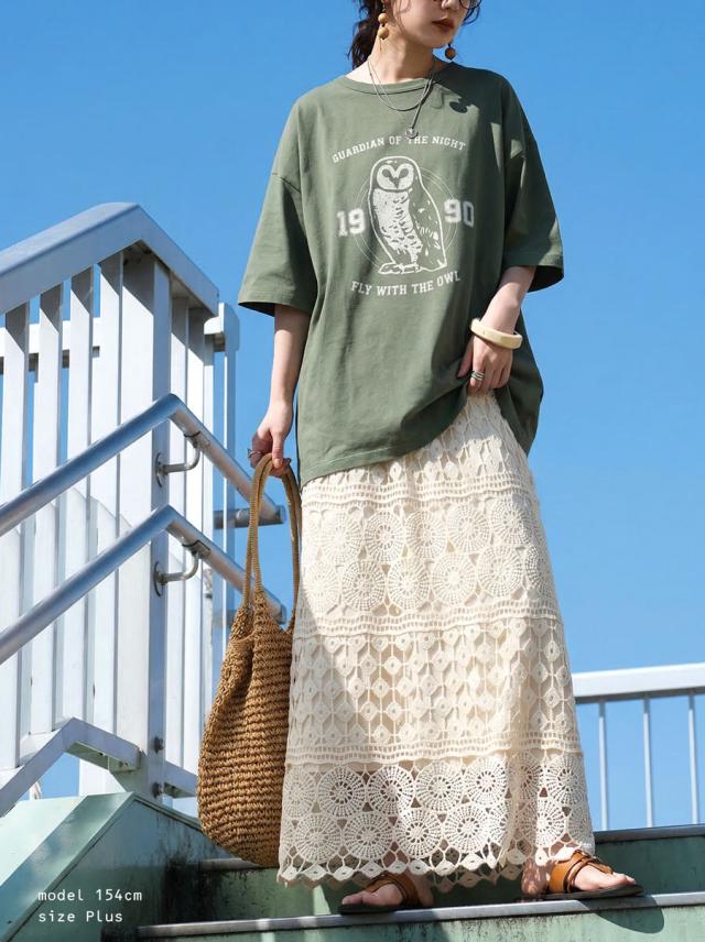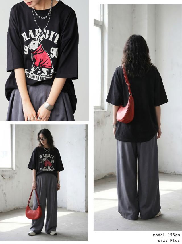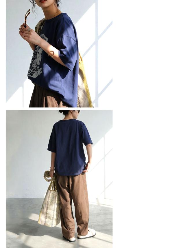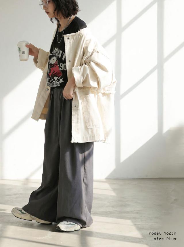 袖丈はラフに着やすい半袖仕様で、大きいサイズ感のリラックスした着心地と体型カバーを叶えるデザインです。