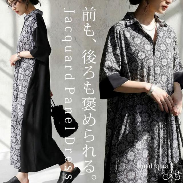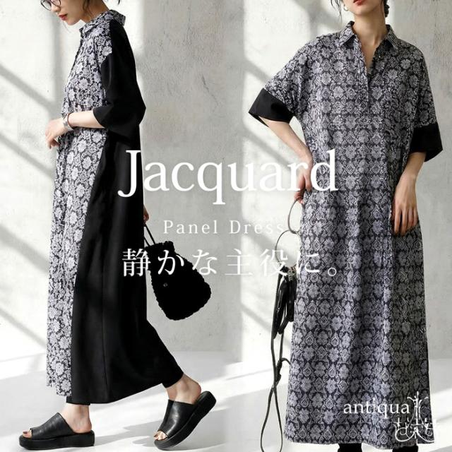 pa-03869 配色 レギュラーカラー 柄ワンピ 無地 切替 ジャガード プルオーバー Aラインシルエット 切替デザイン 上品 モード 体型カバー ゆったり カジュアル 普段着 ミモレ丈