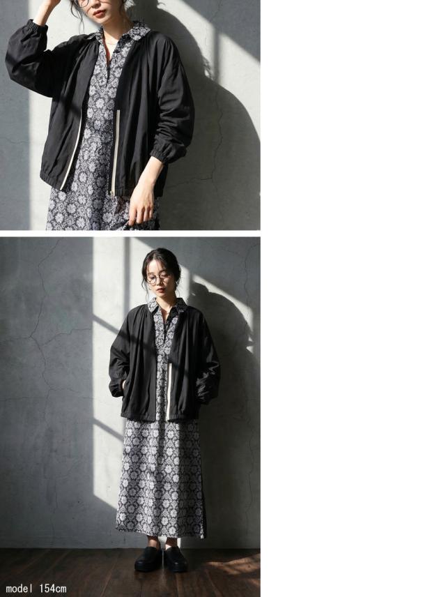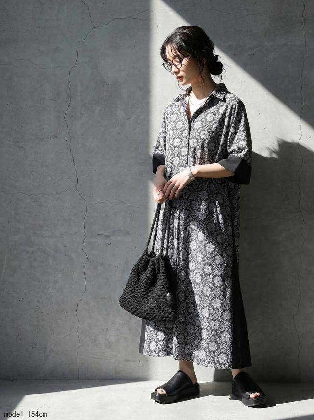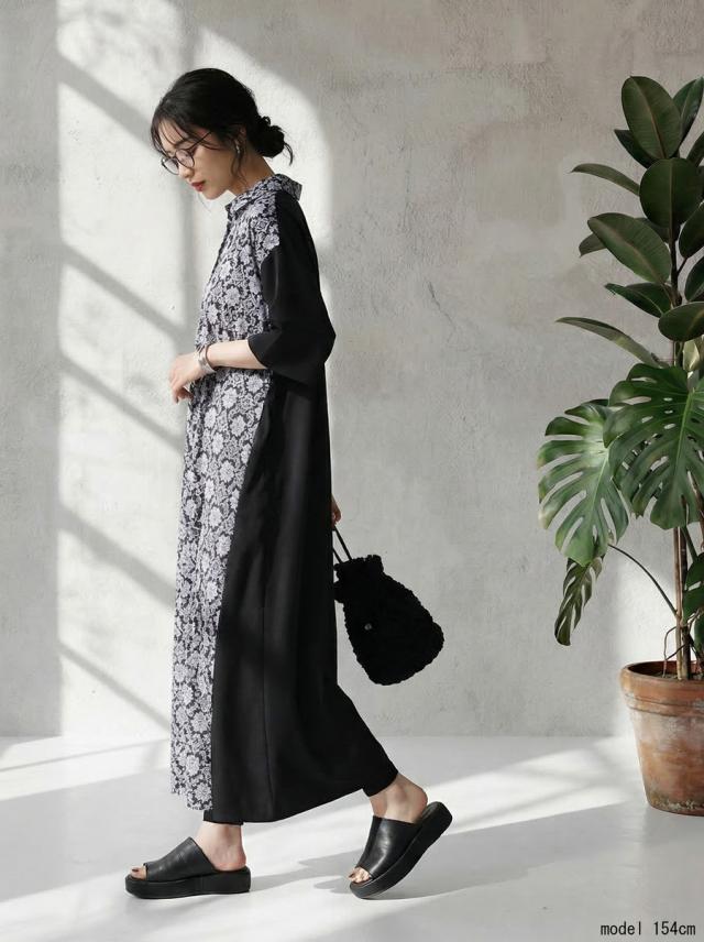 柄と無地の配色切替を取り入れた切替デザインがアクセントになり、Aラインの形状でゆったりとしたシルエットと体型カバーを叶えます。