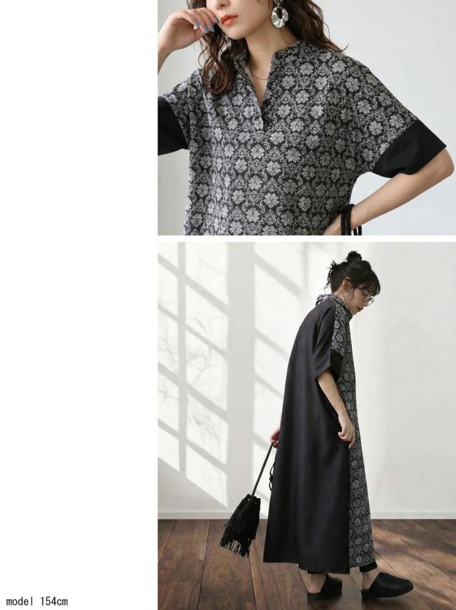 ダマスク柄 ワンピース レディース 半袖 ロング 送料無料・(100)メール便可 春新作